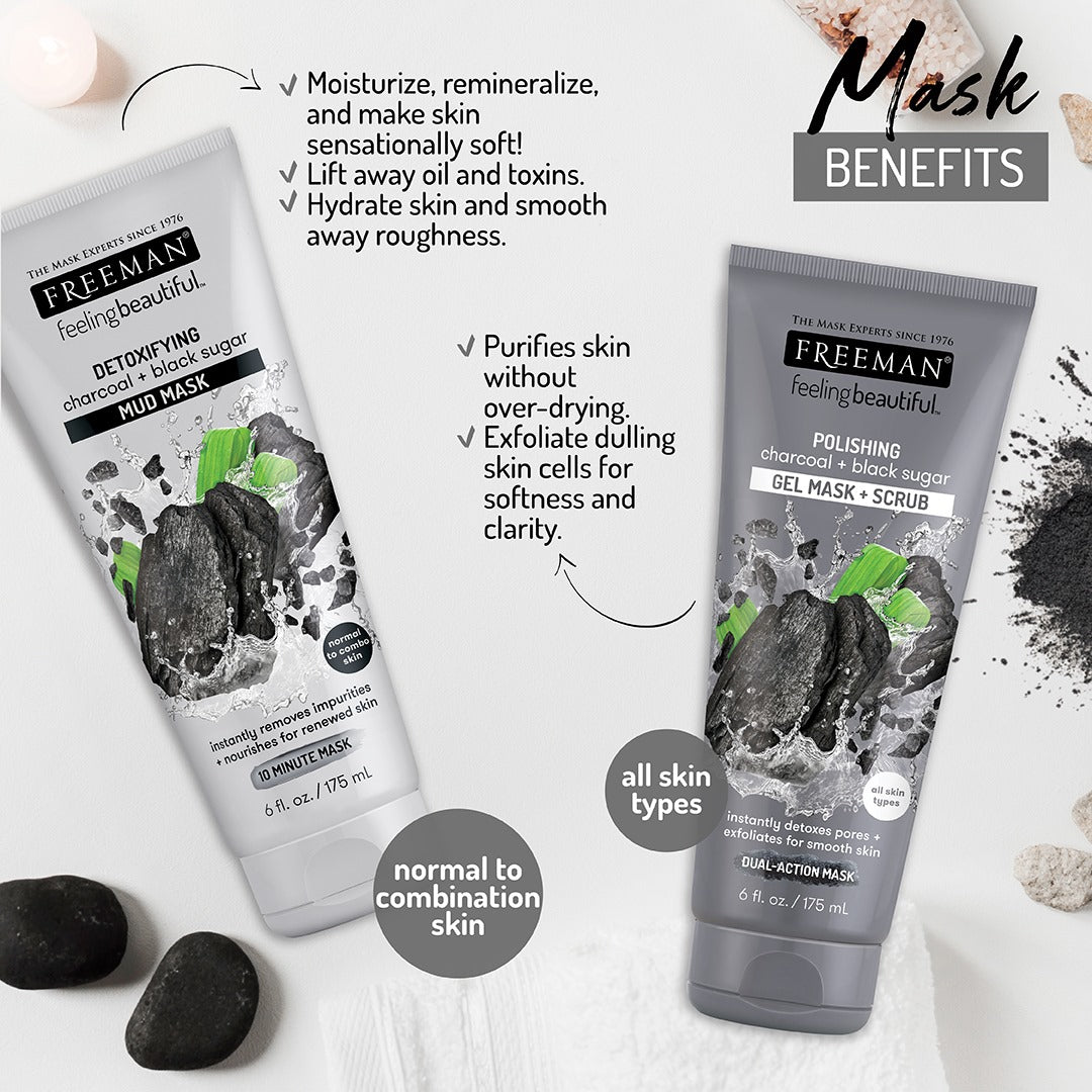 El carbón para exfoliar Freeman & El tubo de mascarilla de gel facial Black Sugar se puede utilizar para todo tipo de piel. Desintoxica instantáneamente los poros y exfolia para una piel suave. Esta mascarilla y exfoliante únicos actúan el doble de tiempo para desintoxicar la piel. El carbón activado purificante ayuda a absorber la grasa y las impurezas sin resecar demasiado y el azúcar negro ayuda a exfoliar las células opacas de la piel para brindar suavidad y claridad.