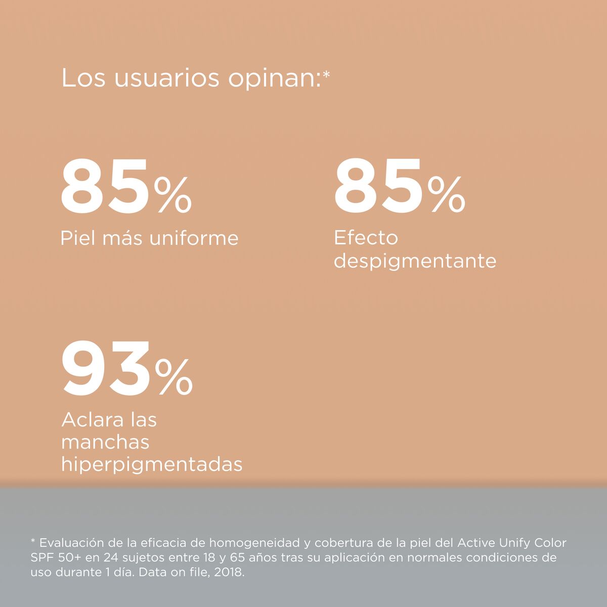 - La fórmula de Active Unify Color SPF 50+ contiene ingredientes con acción despigmentante que acalaran y unifican el tono, ayudan a regenerar la piel y tienen propiedades antioxidantes,