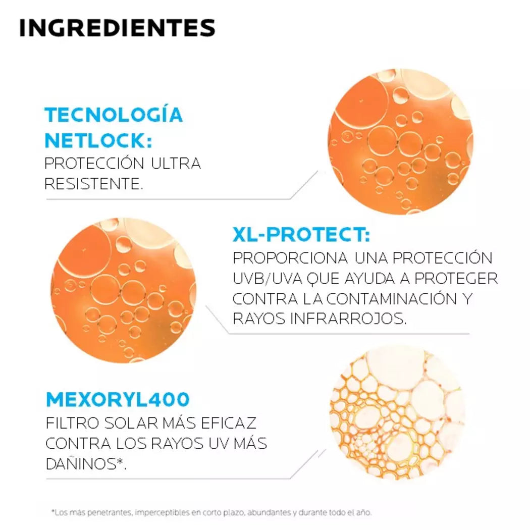TECNOLOGÍA NETLOCK TM: Muy alta protección en una textura invisible. Con una fórmula no grasa, no pegajosa. Sus microgotas se combinan para formar una protección fuerte, homogénea, no migratoria y muy resistente.