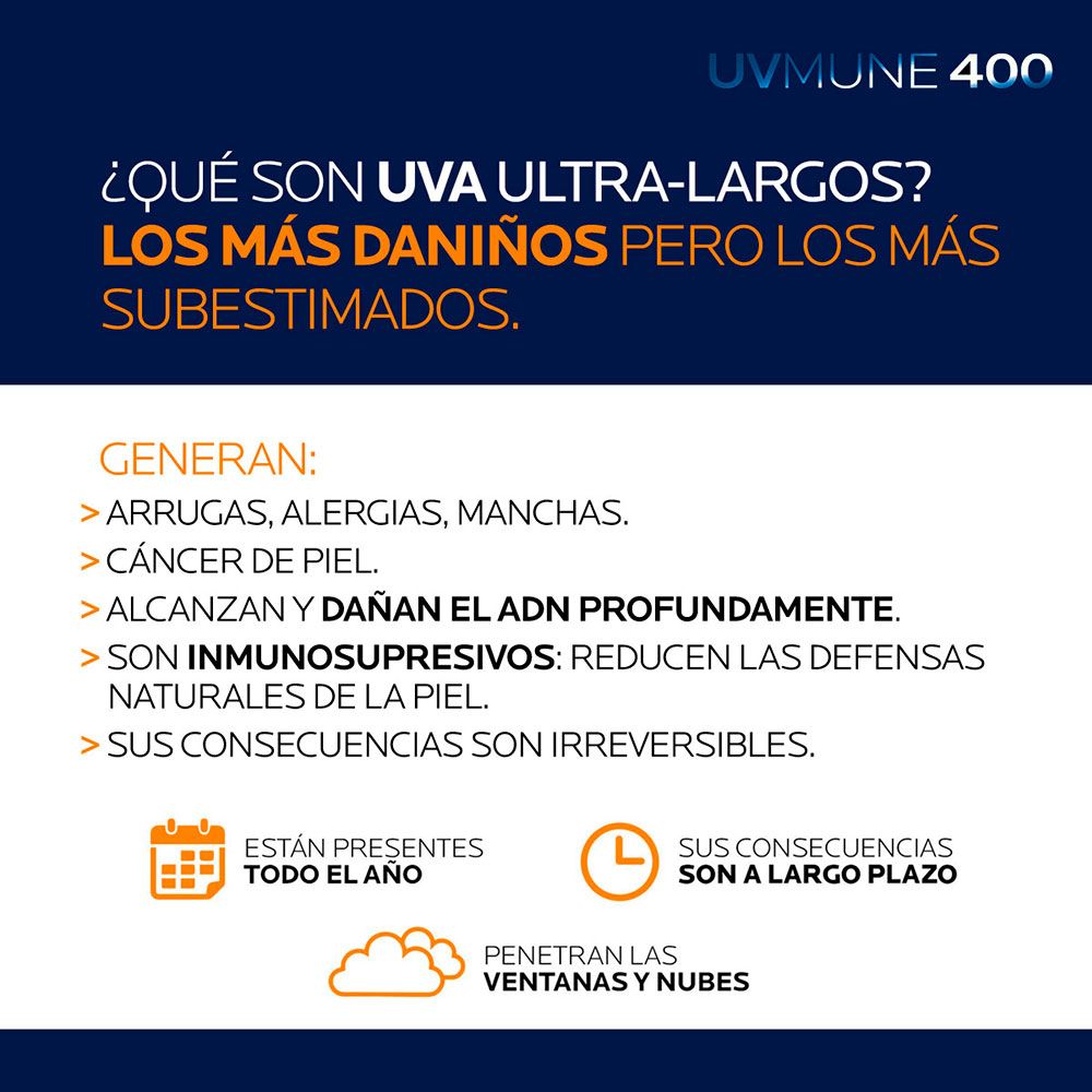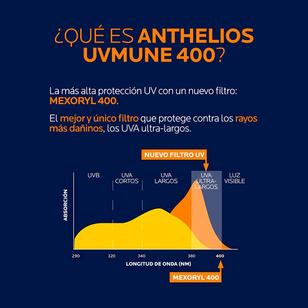 Protección Avanzada UVMUNE 400: Nuestra máxima protección contra los rayos UVA ultra largos* con nuestro filtro patentado. Este fluido incorpora la tecnología UVMUNE 400, ofreciendo una protección superior contra los rayos UVA y UVB, preservando la salud de tu piel a largo plazo.