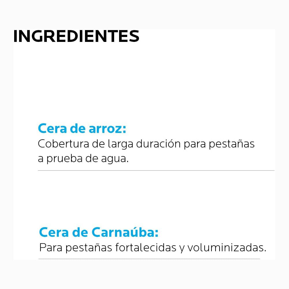 Cómo aplicar: Colocar el cepillo en la raíz de las pestañas y deslizarlo lentamente hacia las puntas haciéndolo rotar suavemente. Aplicar en una sola pasada por toda la longitud de la pestaña para separarlas. No apelmaza ni deja grumos. Para un resultado más intenso, aplicar una segunda capa de máscara en las pestañas. Para conseguir un desmaquillado fácil, utiliza un desmaquillante de ojos bifásico resistente al agua.