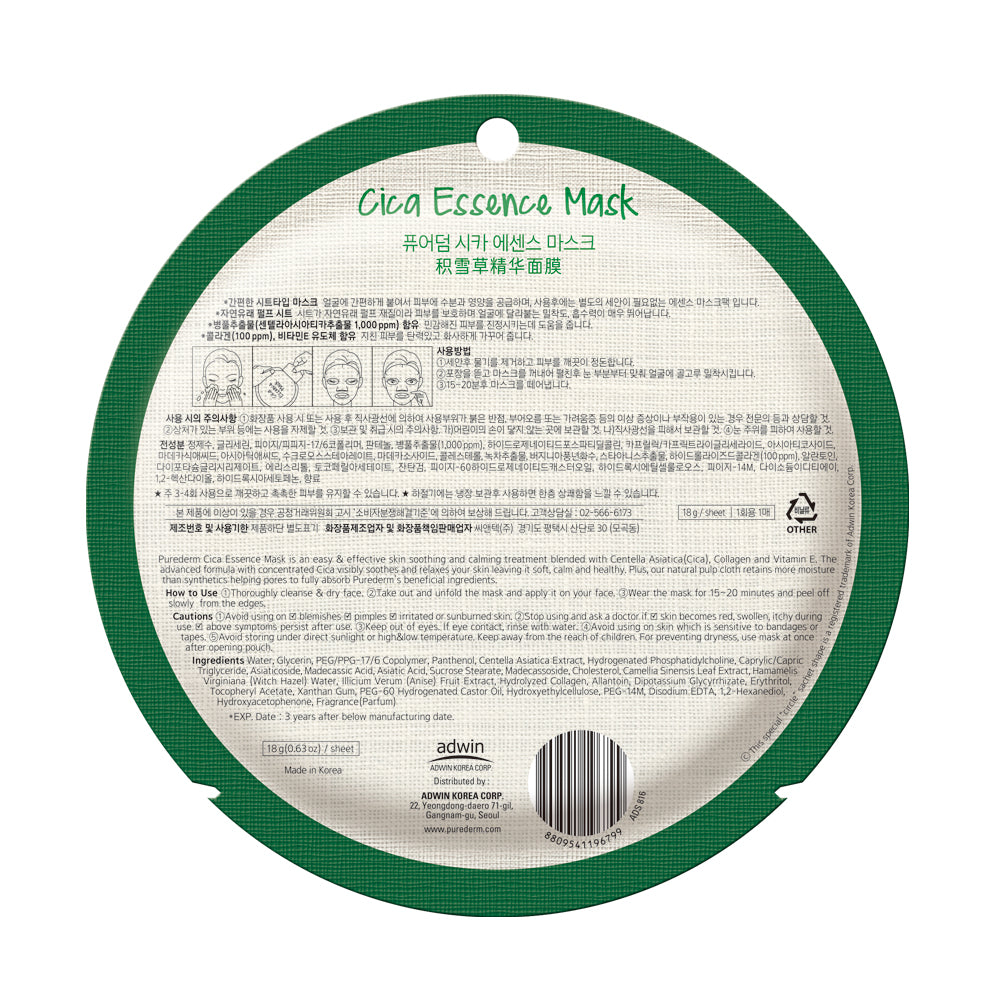 PUREDERM Cica Essence Mask, Mascarilla con Esencia de Cica, 18gr.