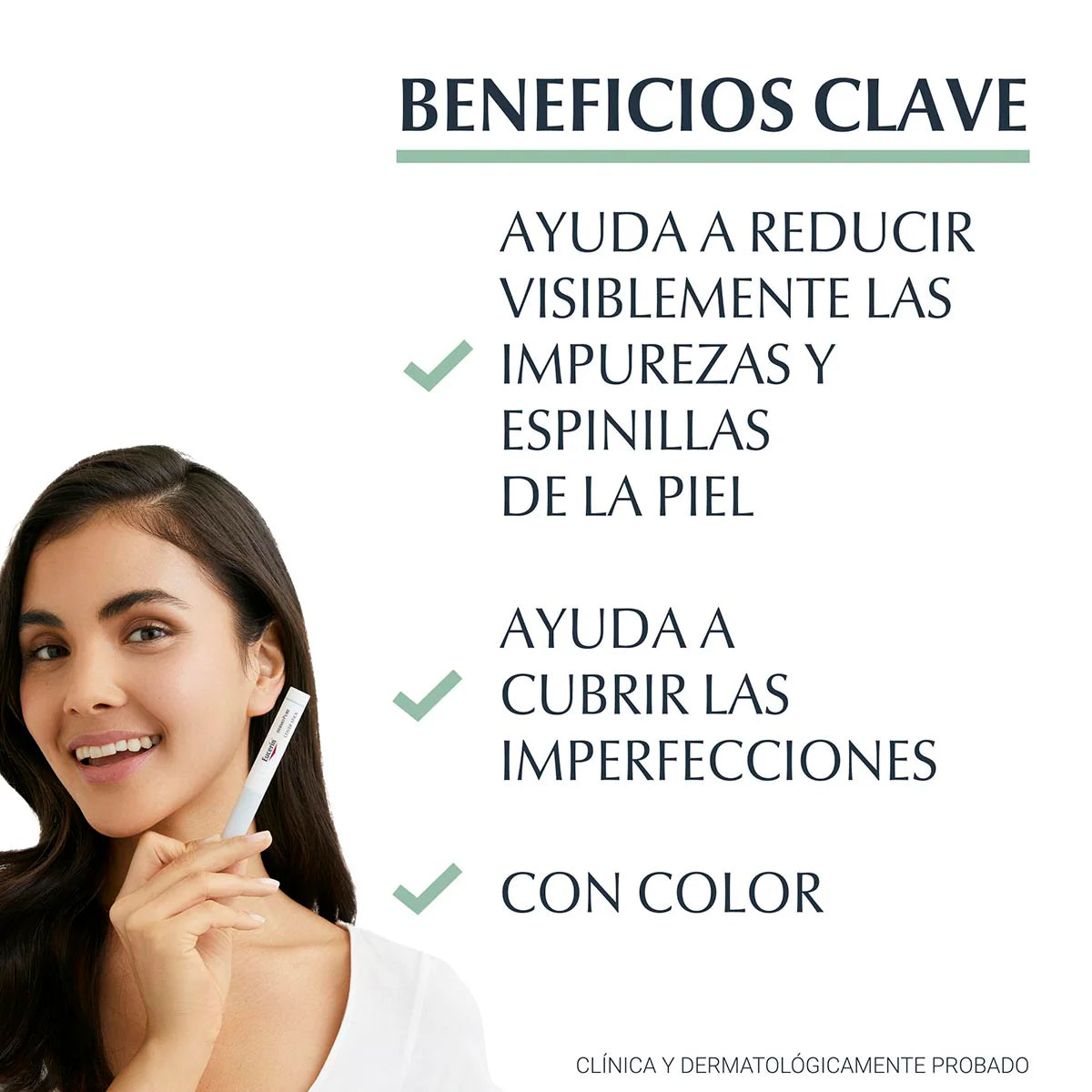 Eucerin DermoPure Cover-Stick es un tratamiento de doble acción para reducir las impurezas y cubrir las imperfecciones, con ácido salicílico, ayuda a reducir visiblemente las impurezas y las espinillas de la piel, ayuda a cobrir las imperfecciones, con color.