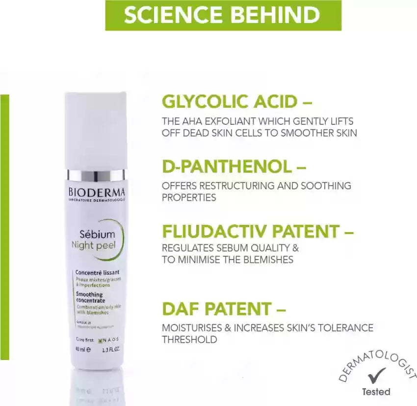 Renovación Celular Profunda: Bioderma Sébium Night Peel utiliza una combinación de ácidos exfoliantes suaves, como el ácido glicólico y el ácido láctico, para promover la renovación celular durante la noche. Este proceso ayuda a eliminar las células muertas de la piel, desobstruir los poros y reducir la apariencia de imperfecciones, dejando la piel más suave y uniforme.