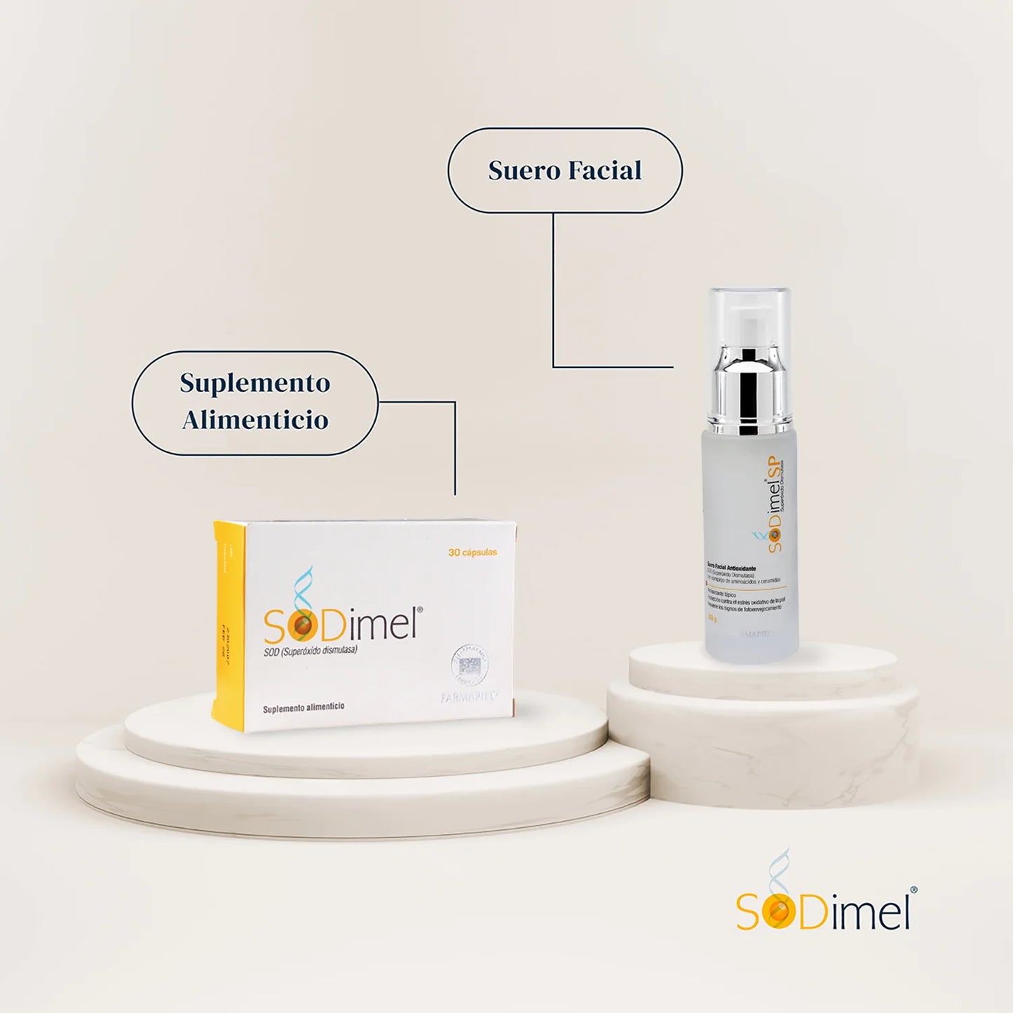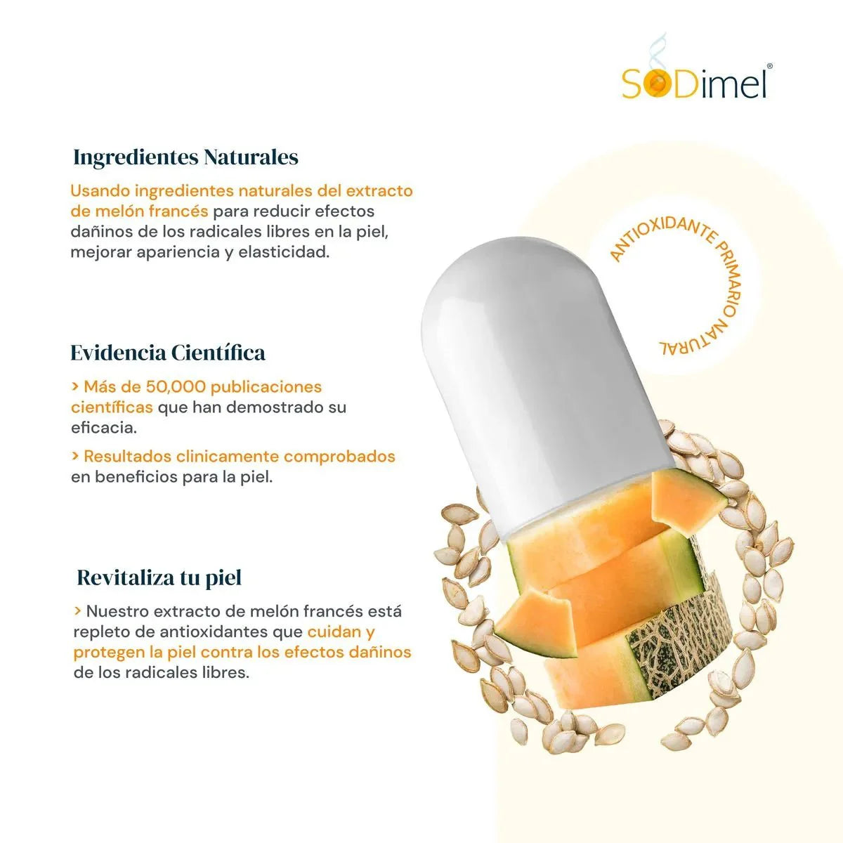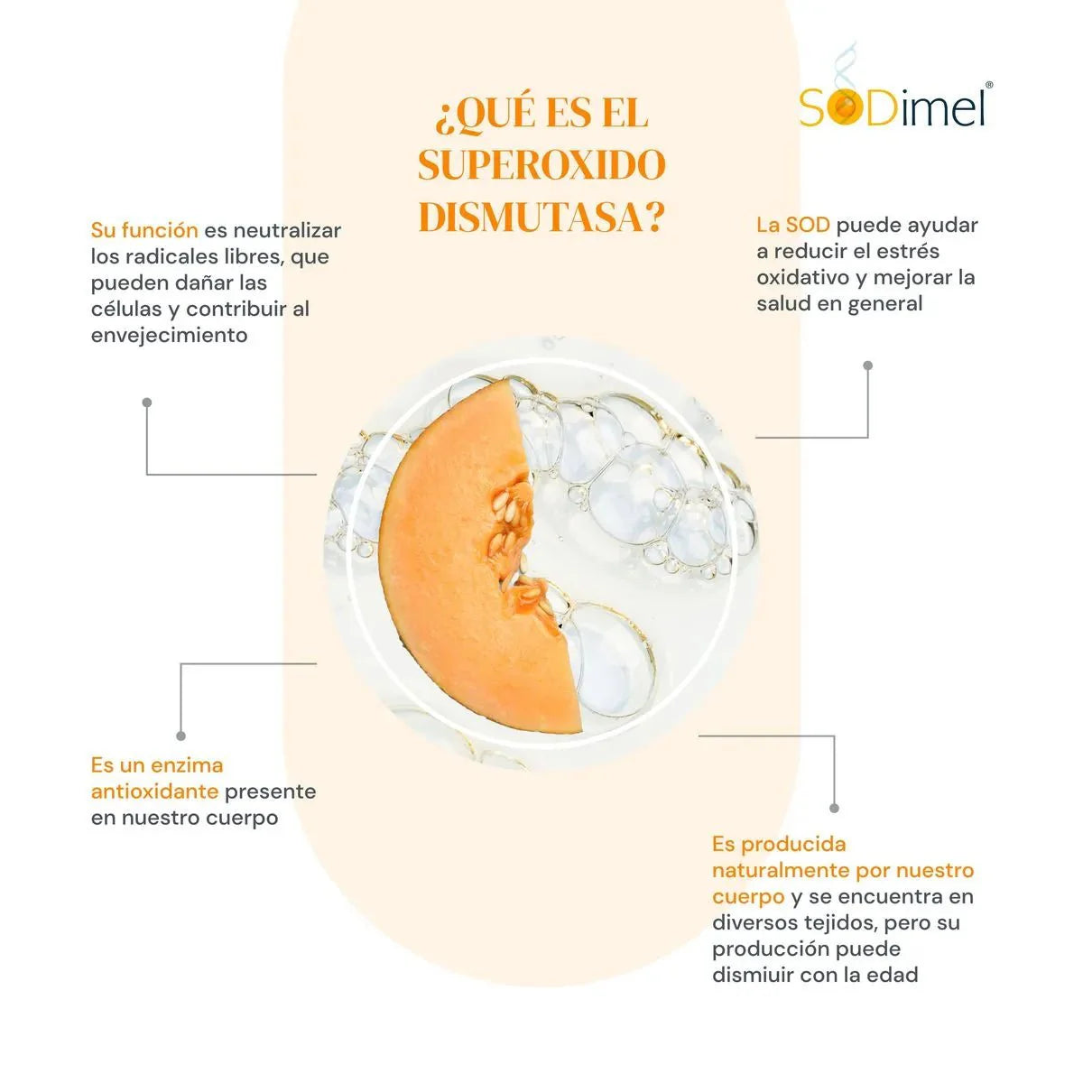 El compuesto activo de Sodimel® es superóxido dismutasa proveniente del melón Francés Cantaloup (cucumis melo). Desarrollado con tecnología de microencapsulación y recubierto, lo que asegura su absorción y eficacia, sin riesgo de toxicidad, libre de gluten y de alérgenos.