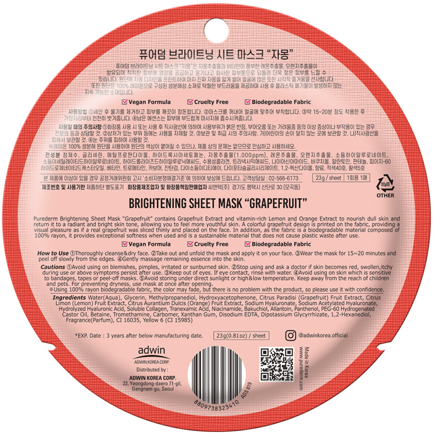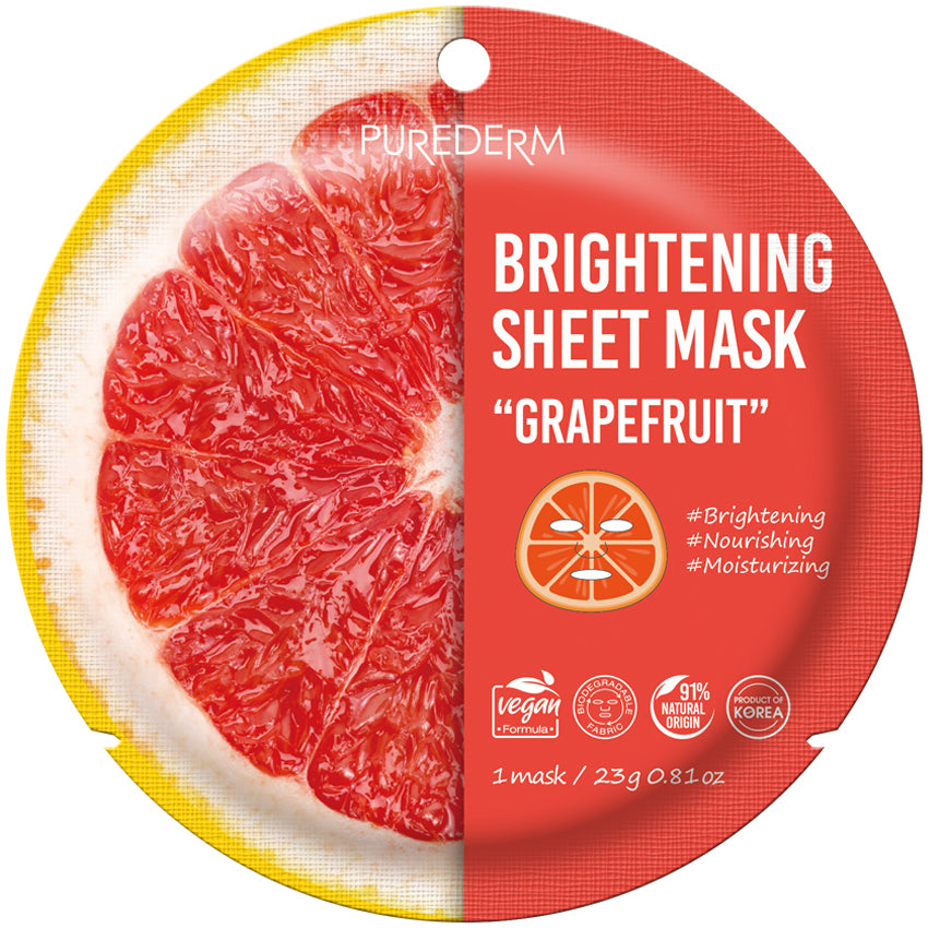 Descubre la luminosidad con PUREDERM Brightening Sheet Mask Grapefruit, porque tu piel merece el resplandor que solo la frescura de la toronja (pomelo) puede brindar. Eleva tu rutina de cuidado y revela una piel que brilla con la vitalidad única de la belleza coreana. ¡Cada aplicación es un recordatorio de que tu luminosidad interior merece brillar en el exterior!