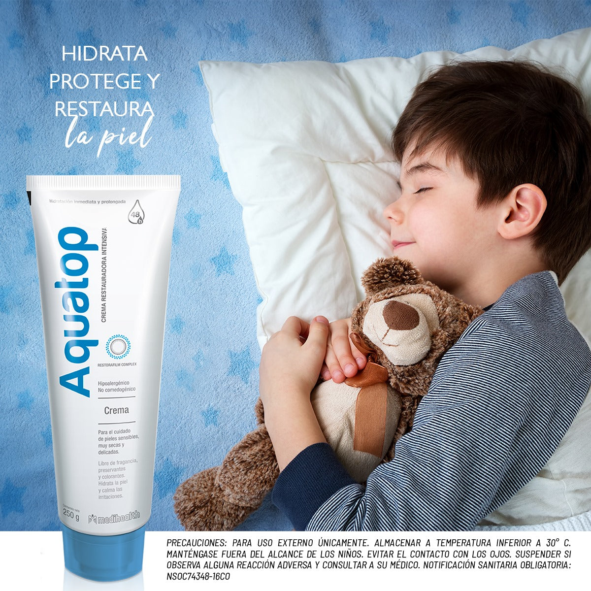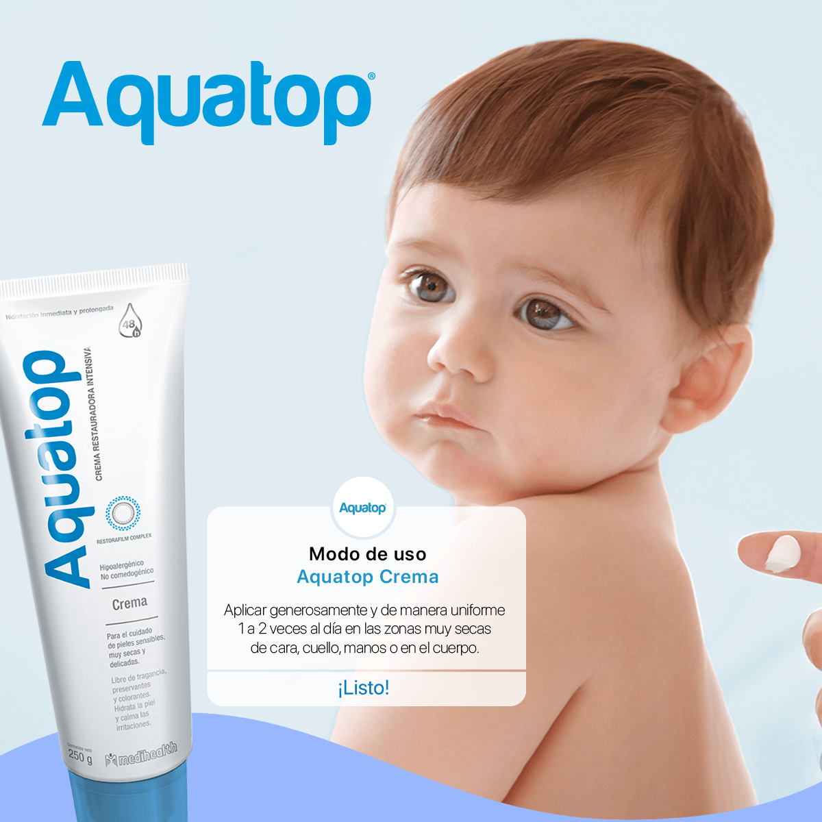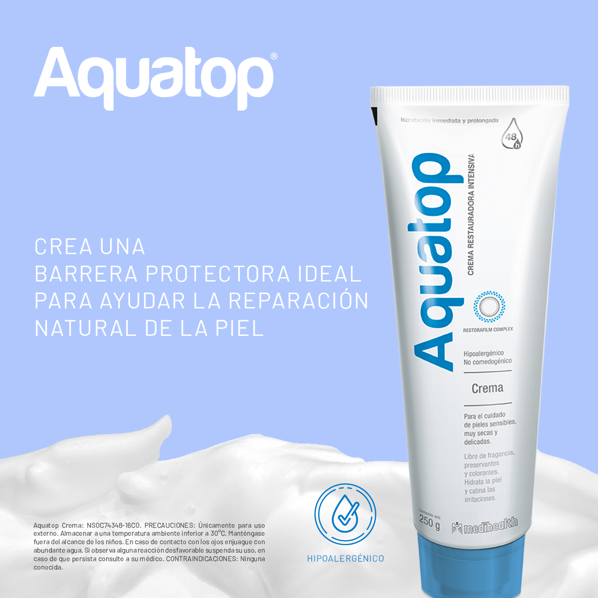 La fórmula de Aquatop Crema contiene Restorafilm Complex, una novedosa mezcla de ingredientes que fortalecen y restauran la barrera lipídica de la piel y permiten ofrecer hidratación inmediata y de larga duración (hasta por 48 horas).