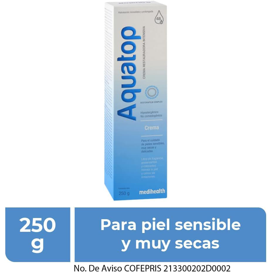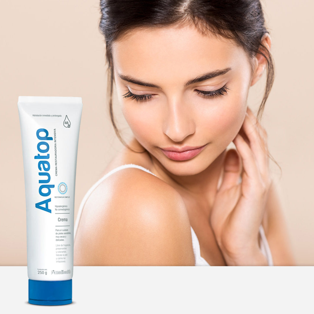 Sus liposomas hidratantes penetran en las capas de la piel optimizando el nivel de hidratación. Aquatop Crema contiene agentes que alivian la resequedad y los signos asociados a la pérdida de hidratación cutánea, por lo cual es ideal para el cuidado de pieles sensibles, muy secas y delicadas.