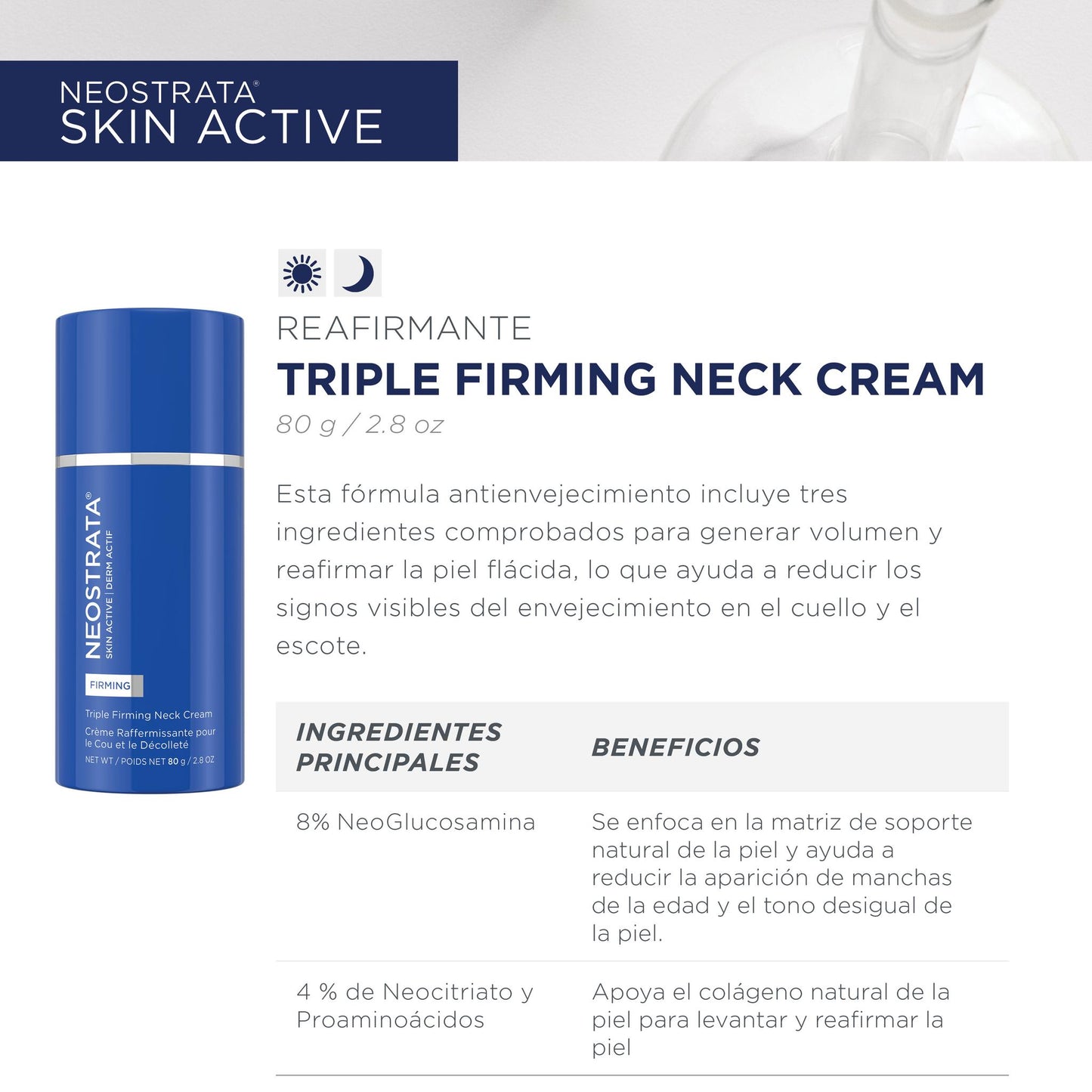 No comprometas su belleza y firmeza. NEOSTRATA Skin Active Crema Reafirmante para Cuello y Escote es más que una crema: es una inversión en tu confianza y en la salud de tu piel.