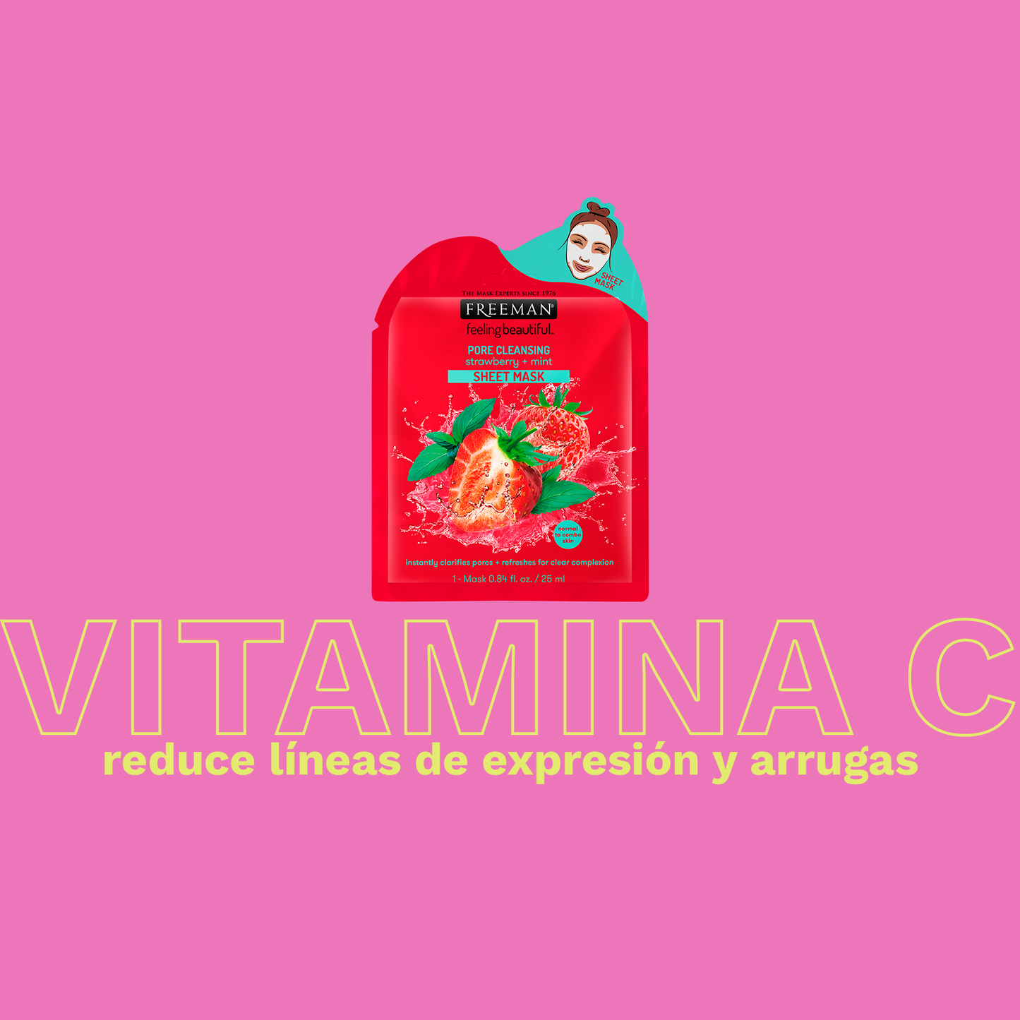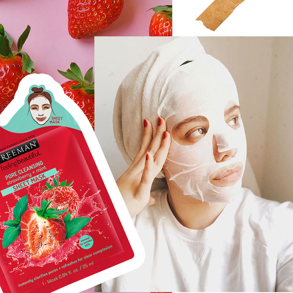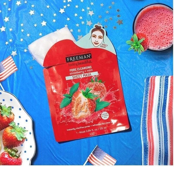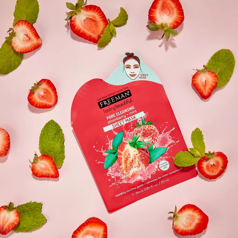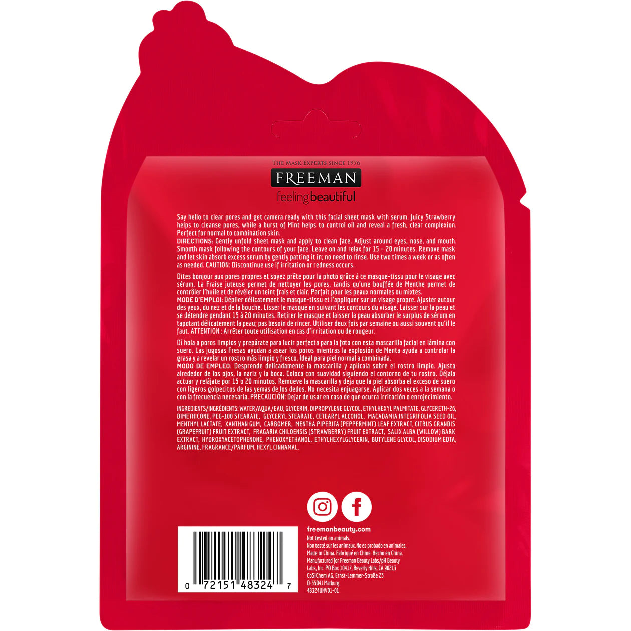 FREEMAN Pore Cleansing Strawberry & Mint Sheet Mask, Limpiador de Poros Fresa & Mascarilla de hoja de menta, 25ml.