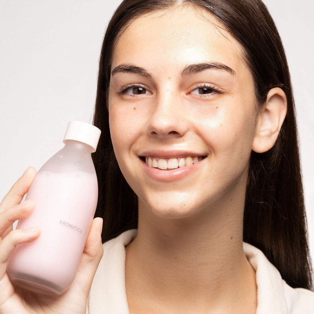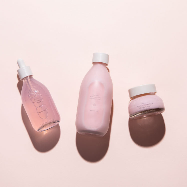 Aromatica se lució al crear uno de los tónicos más bonitos que hemos visto. Su fórmula es 100% orgánica, y se separa en una parte color rosa y otra color blanco gracias a propiedades emolientes e hidratantes en forma de dos capas, ideal para pieles maduras, secas o sensibles.