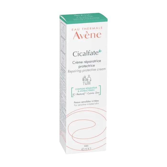 Calma, protege y ayuda a reparar* la piel irritada de toda la familia. Forma una película protectora en las zonas irritadas de las capas superficiales de la epidermis y crea un efecto «apósito» que protege la piel. Su fórmula presenta una combinación de Agua termal de Avène e ingredientes reparadores y purificadores [C+-Restore]™ : Sulfato de Cobre y Sulfato de Zinc. Cicalfate+ Crema protectora reparadora también es apta para su uso externo en las zonas íntimas.