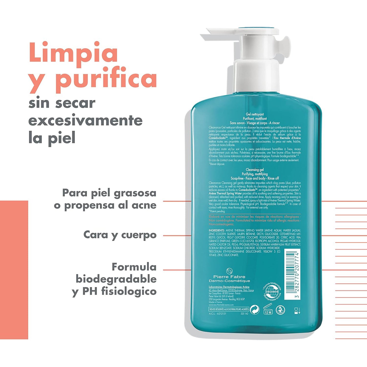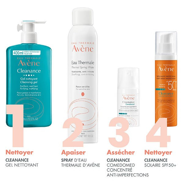 Su fórmula, respetuosa con las pieles sensibles, tiene una combinación exclusiva de ingredientes activos con triple beneficio: Limpieza delicada gracias a una base limpiadora suave, un efecto matificante garantizado por el Comedoclastin™, un ingrediente de origen vegetal derivado de las semillas de cardo mariano con propiedades patentadas* que ayuda a reducir el exceso de sebo, y el bienestar proporcionado por el Agua Termal de Avène, calmante y antirritante.