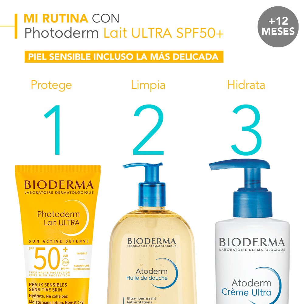 La fórmula de Photoderm Lait ULTRA Famille SPF 50+ de Bioderma contiene filtros solares UVA/UVB de amplio espectro, así como agentes hidratantes y antioxidantes, como la vitamina E, que protegen la piel del daño causado por los radicales libres.
