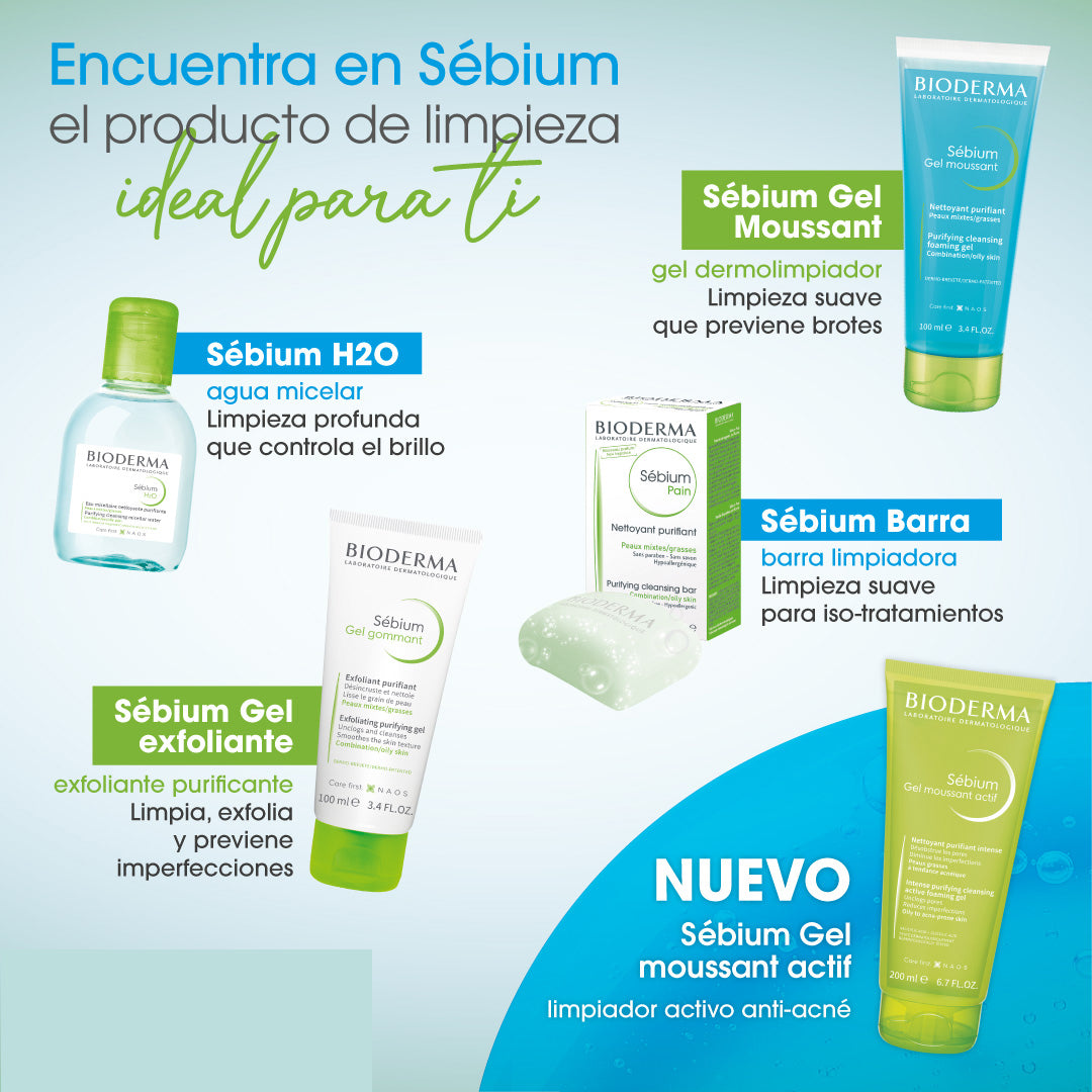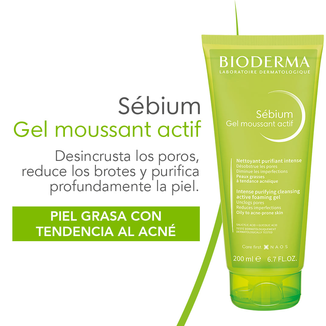 El Sébium Gel moussant Actif es único gel limpiador activo anti-acné que desincrusta los poros y reduce los brotes debido a que contiene ácido glicólico y ácido salicílico, mismos que promueven la renovación celular y desbloquea los conductos sebáceos (destapa poros).