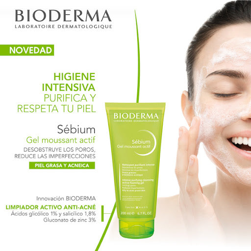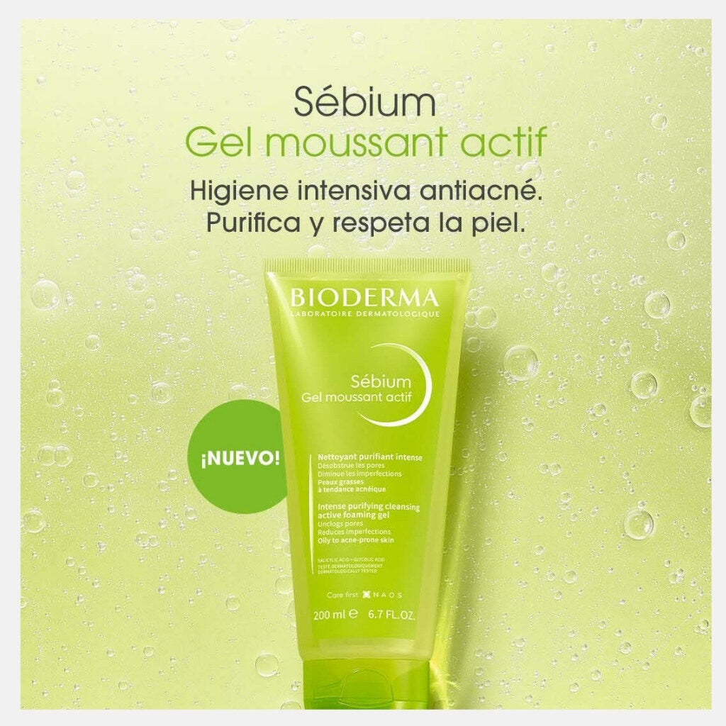 BIODERMA Sébium Gel moussant Actif, Higiene Intensiva Anti-Acné, 200ml.