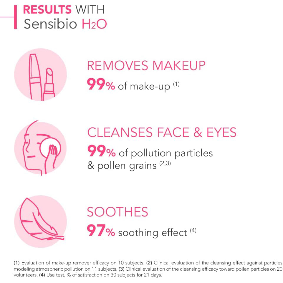 -Sensibio H2O contiene agua altamente purificada y de tipo farmacéutico. También cuenta con un complejo de 3 azúcares biomiméticos calmantes que previenen el proceso inflamatorio. Los ingredientes se seleccionan cuidadosamente para asegurar una tolerancia perfecta y garantizar que ningún resto de producto dañe la piel.