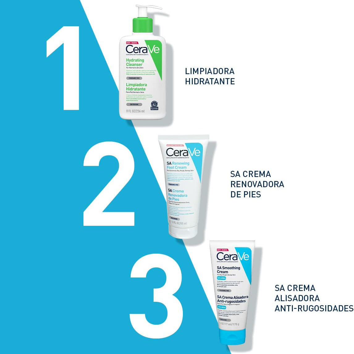 ¡Ponle fin a la sequedad y la rugosidad en tus pies con la Crema Renovadora de Pies CeraVe SA! La Crema Renovadora de Pies de CeraVe está formulada con Ácido Salicílico y 3 ceramidas esenciales, que exfolia, hidrata profundamente la piel agrietada o extremadamente seca, mientras ayuda a restaurar la barrera protectora de la piel. Libre de fragancias, sin parabenos, no es comedogénica. Humecta de manera efectiva y es de rápida absorción, no grasosa.