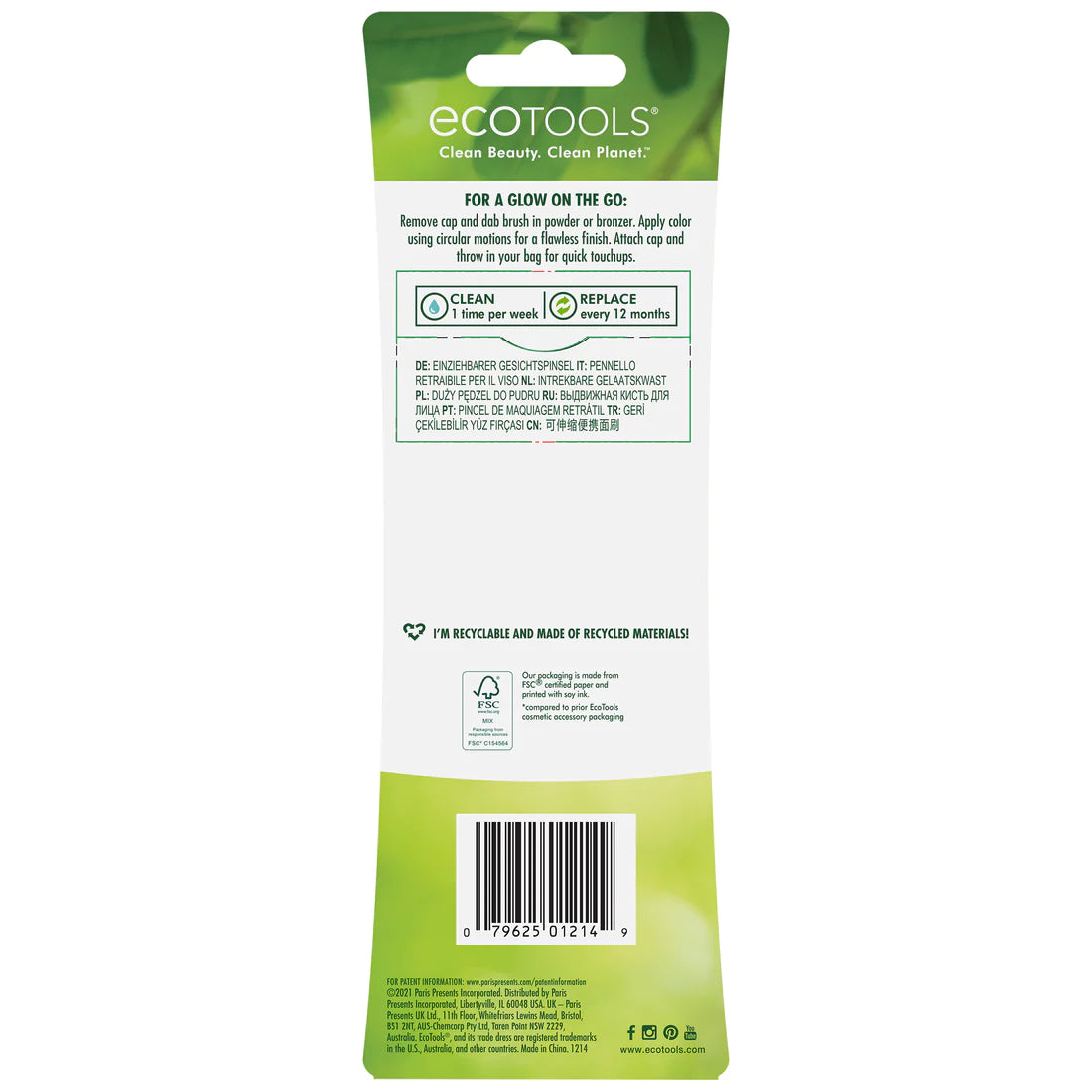 • La brocha de maquillaje retráctil EcoTools está diseñada con cerdas suaves y completas para una aplicación versátil de maquillaje sobre la marcha. • Diseñado para pieles sensibles y aplicación versátil de polvos y bronceadores. • Simplemente retira la tapa y aplica el producto de maquillaje con la brocha. • Incluye tapa para guardarlo sin problemas. • Se utiliza mejor con polvos y bronceadores. • Cerdas maravillosamente suaves para una aplicación suave del maquillaje. • Hecho a mano con materiales ecológicos y mangos de bambú livianos. • Fabricado con cerdas sintéticas de Taklon y elegantes casquillos de aluminio. • Veganos y libres de crueldad animal: los productos EcoTools nunca se prueban en animales.