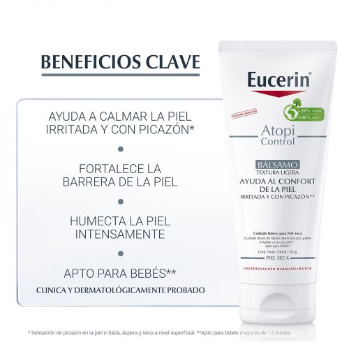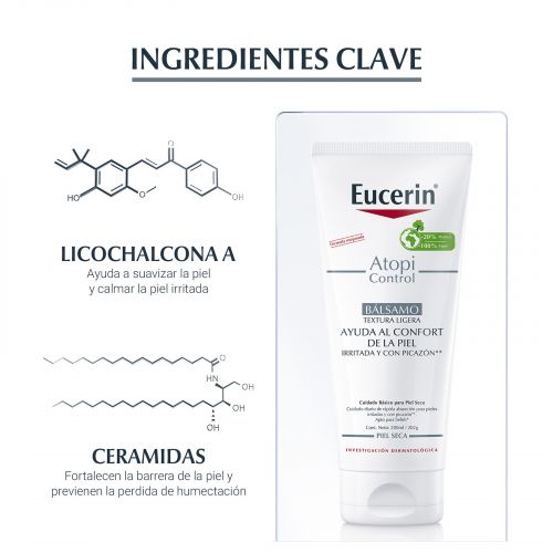 Eucerin AtopiControl Bálsamo es un bálsamo corporal de uso diario que se ha formulado especialmente para suavizar e hidratar intensamente la piel irritada y con picor. El bálsamo de agua en aceite, ligero y nutritivo, está enriquecido con licocalcón A, ceramidas y manteca de karité para fortalecer la barrera de la piel y aliviar la sequedad y el picor. Se debe usar a diario junto a Eucerin AtopiControl Crema Forte, Eucerin Spray Calmante y su medicación habitual.