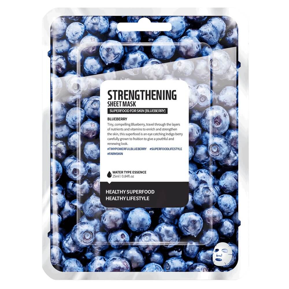 Farm Skin Superfood For Skin Facial Sheet Mask Blueberry tiene un efecto fortalecedor e hidratante general. Los ingredientes activos de la mascarilla son el calostro y el extracto de arándano. Esta mascarilla quedará genial para todo tipo de piel.
