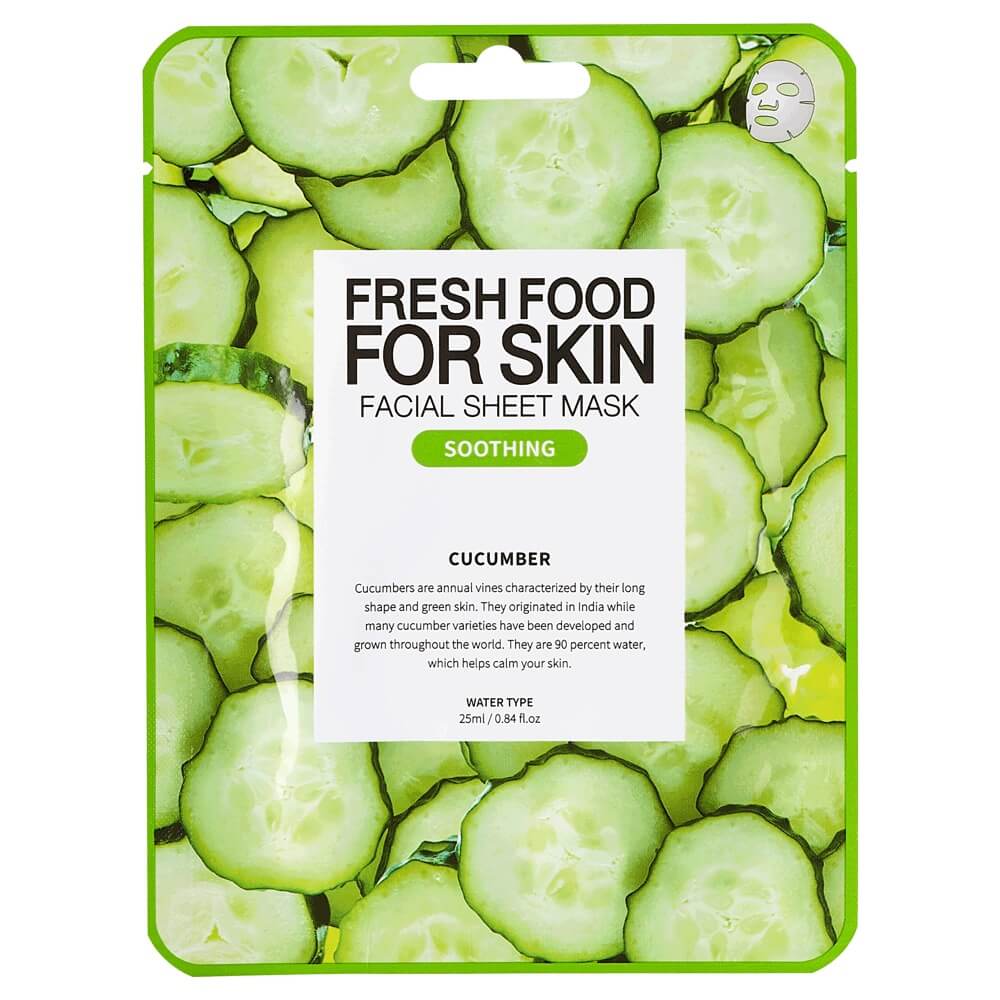 Farmskin Freshfood For Skin Facial Sheet Mask Pepino: la mascarilla facial con agua rica de pepino, que ayuda a que la piel sensible e irritada recupere la calma y proporciona hidratación adicional. El producto contiene nutrientes de pepino y extracto de plantas. Los nutrientes contenidos en los productos proporcionan una nutrición calmante y profunda, especialmente para la piel seca.