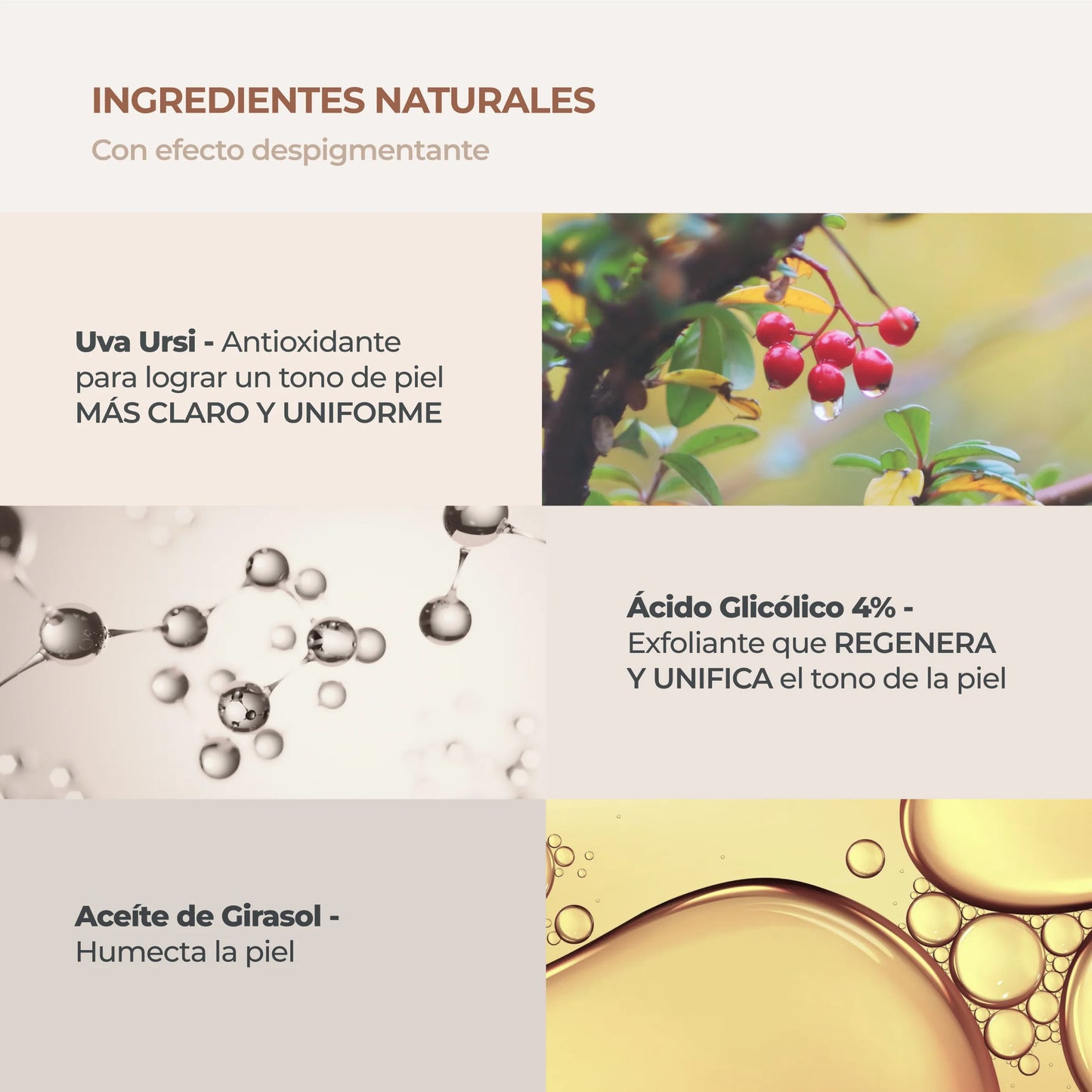 Despigmentación Efectiva: Con una poderosa combinación de ingredientes activos como el Ácido Kójico, la Arbutina y el Ácido Glicólico, nuestra crema despigmentante actúa de manera efectiva sobre las manchas oscuras y la hiperpigmentación, revelando una piel más clara y uniforme con el tiempo.