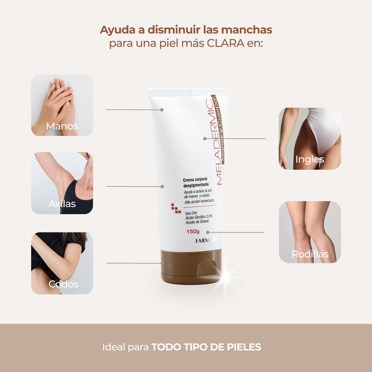 Meladermic Manos y Cuerpo es una crema despigmentante diseñada para aclarar y disminuir manchas en manos, axilas, ingles, cuello y otras zonas extensas del cuerpo.