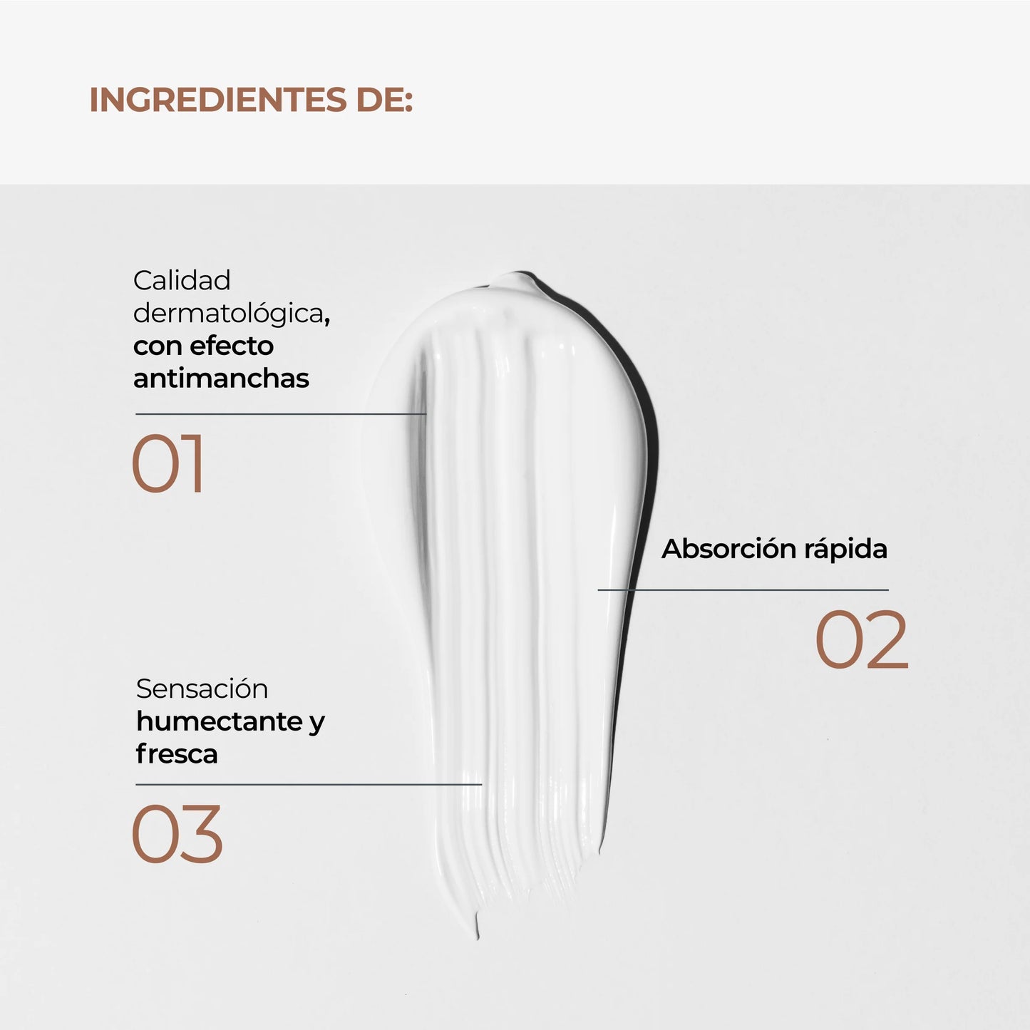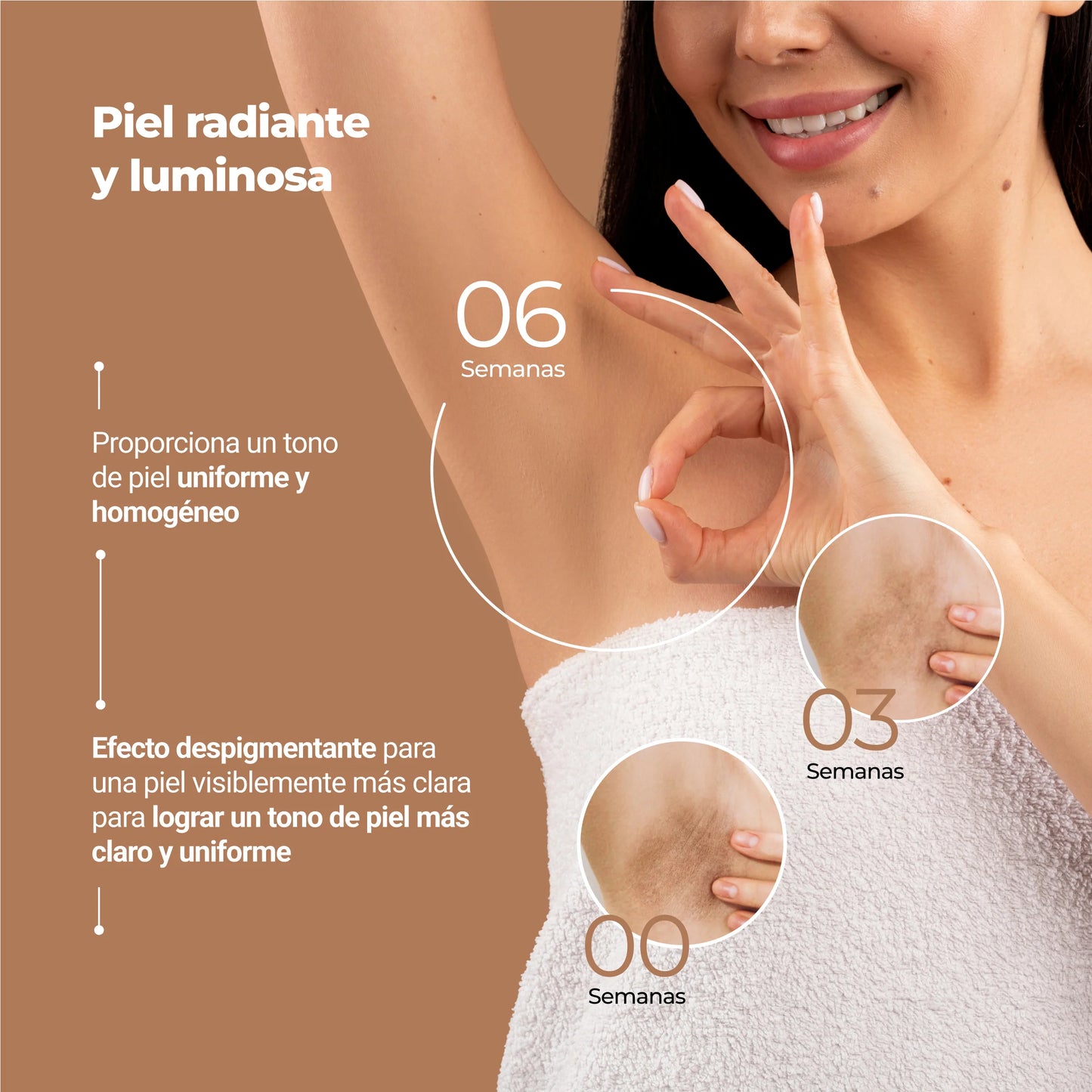 Hidratación Profunda: Enriquecida con ingredientes hidratantes como la Manteca de Karité y el Aceite de Jojoba, nuestra fórmula no solo combate las manchas, sino que también nutre e hidrata profundamente la piel, dejándola suave, tersa y radiante.