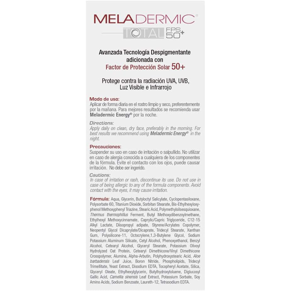 Meladermic Total es un suero facial despigmentante con protección solar FPS 50+, diseñado para aclarar las manchas leves gracias a su complejo Brightenyl. Contiene Alfa-Arbutina que ayuda a unificar el tono de la piel. Protege contra la radiación solar previniendo la aparición de nuevas manchas, además de proporcionar un efecto antioxidante.