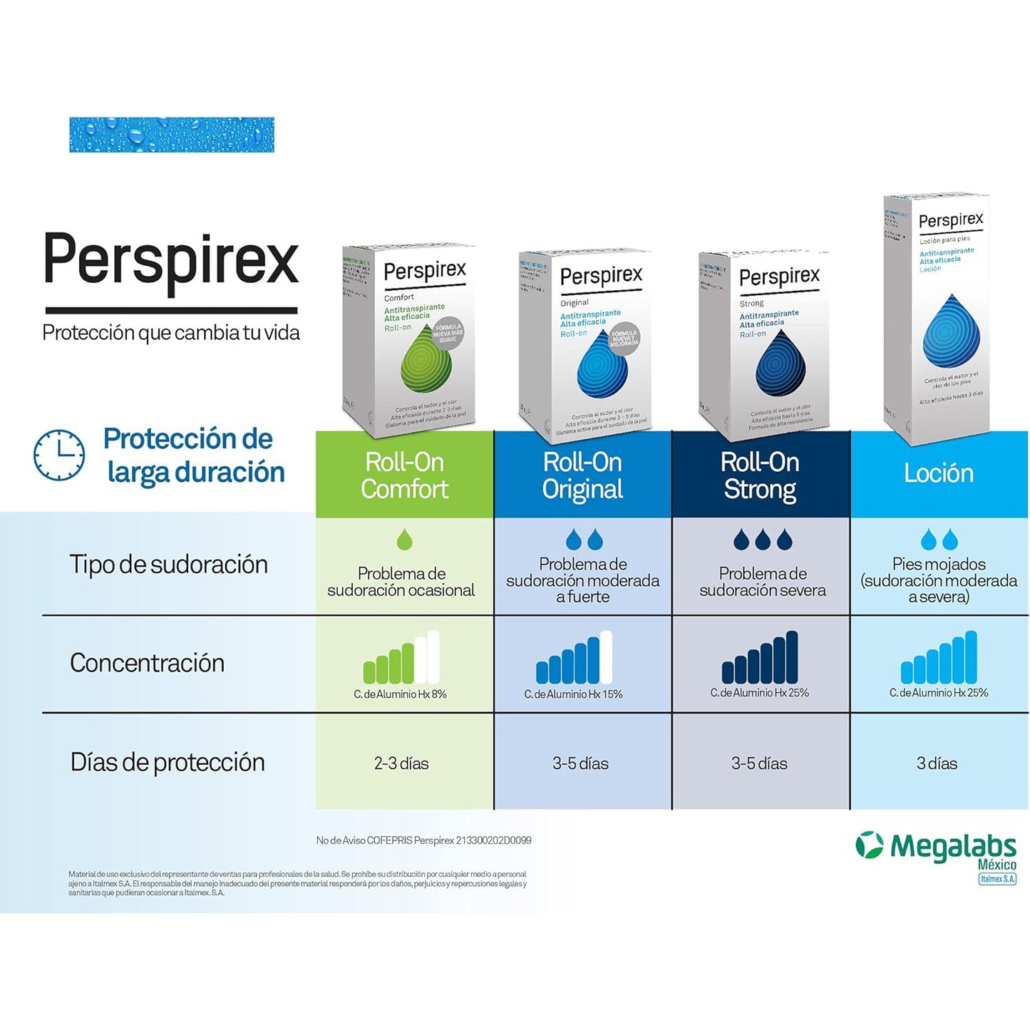 Perspirex Original: Está formulado con: Ingrediente activo: Cloruro de Aluminio Exahidratado al 15%. Otros: Alcohol Denat., Lactato de Calcio, Hidroxipropilcelulosa, Aceite de Castor Hidrogenado.