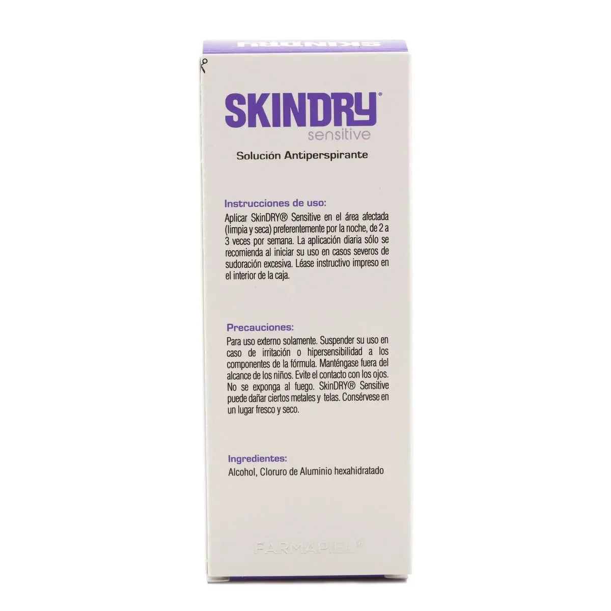 Utilizarse preferentemente por la noche de 2 o 3 veces por semana. En casos severos se recomienda el uso diario. Previo a la aplicación de Skindry, limpia y seca completamente la zona donde se utilizará (axilas, palma de manos y planta de pies). Instructivo al interior de la caja.