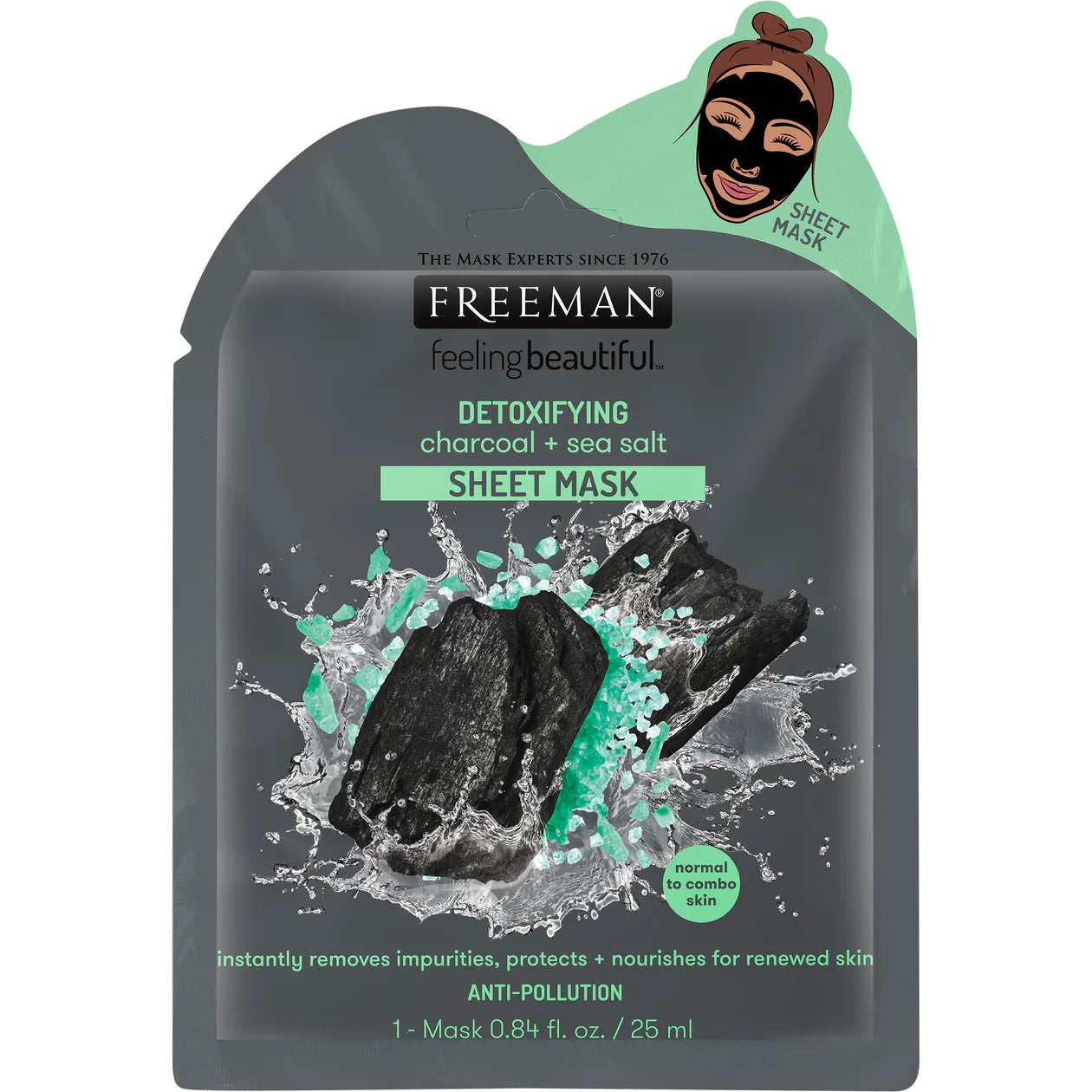 FREEMAN Detoxifying Charcoal & Sea Salt Sheet Mask, Carbón Desintoxicante & Mascarilla en lámina de sal marina. 25ml.
