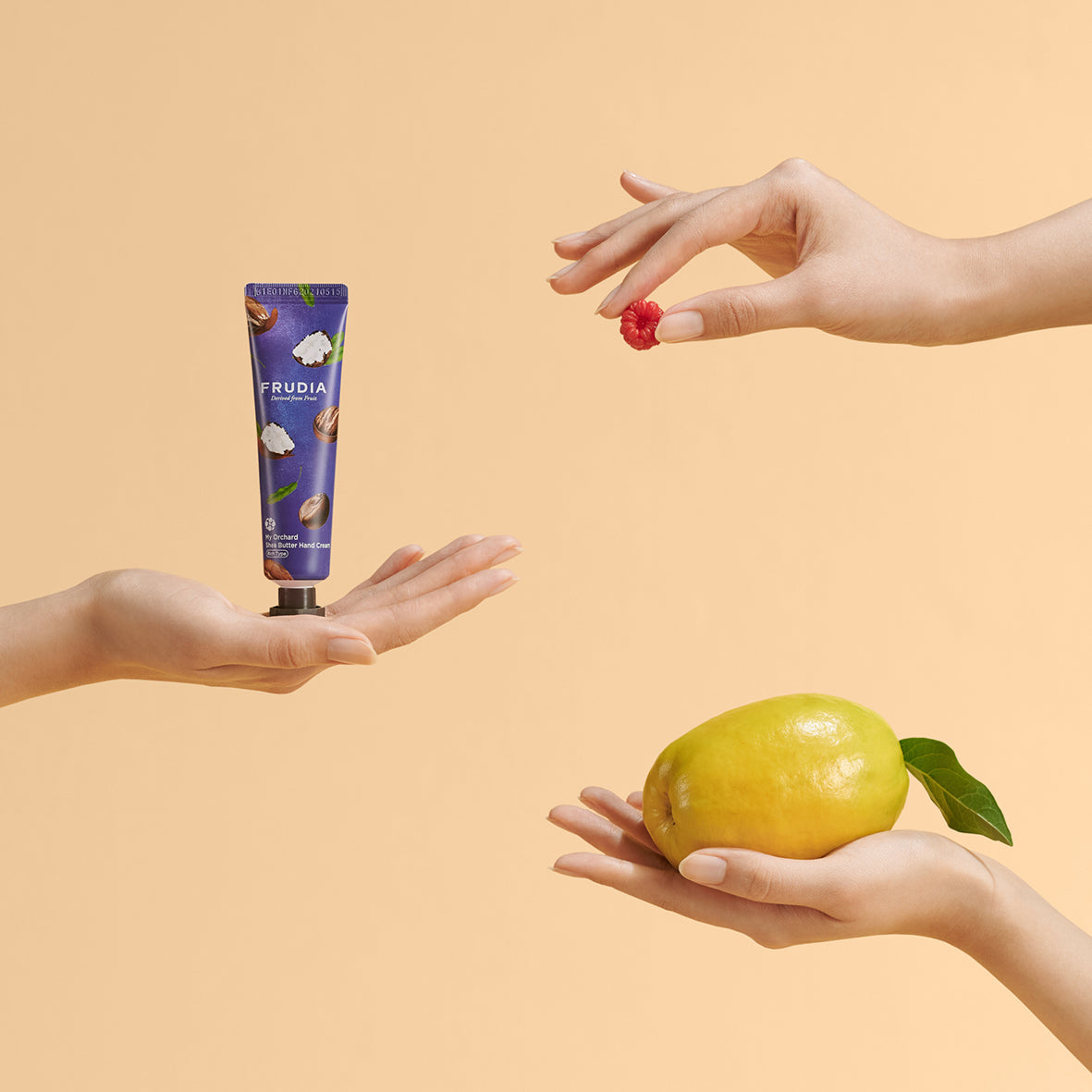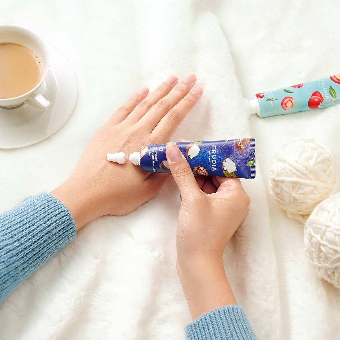 Aplicar una generosa cantidad de Frudia My Orchard Crema de Manos Karité sobre las manos previamente limpias. Luego masajear suavemente.