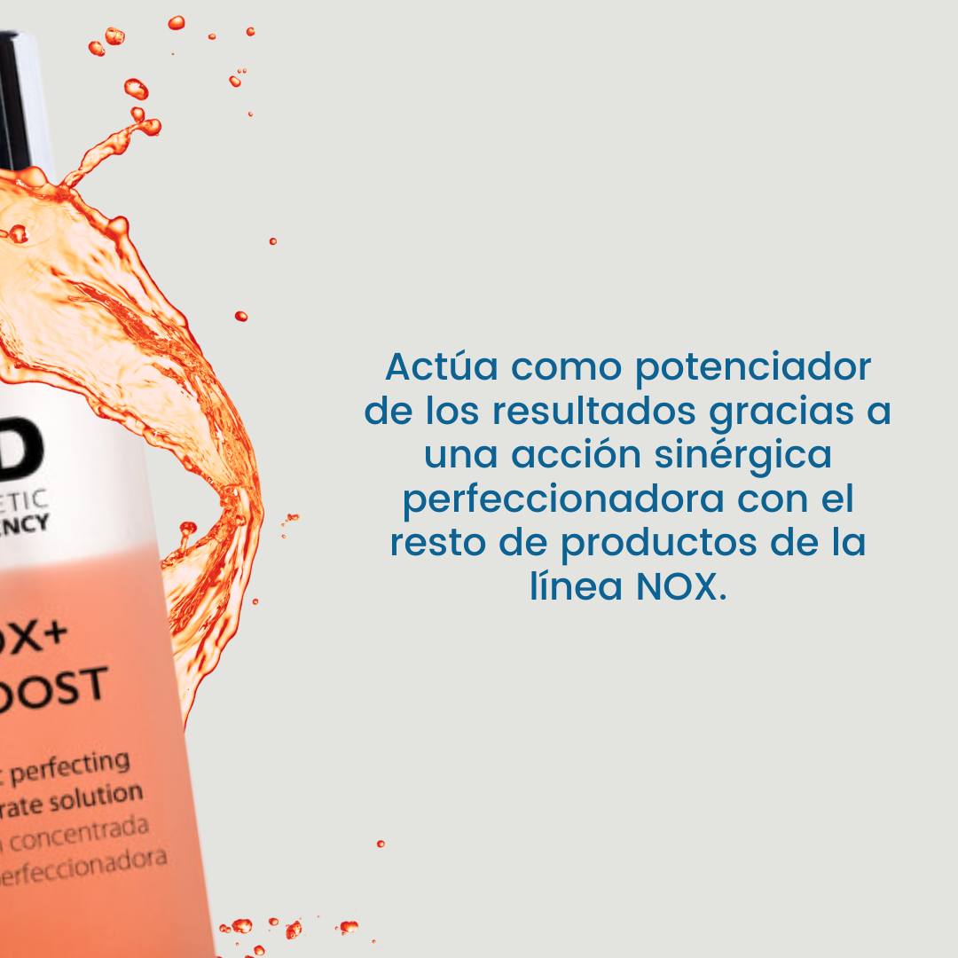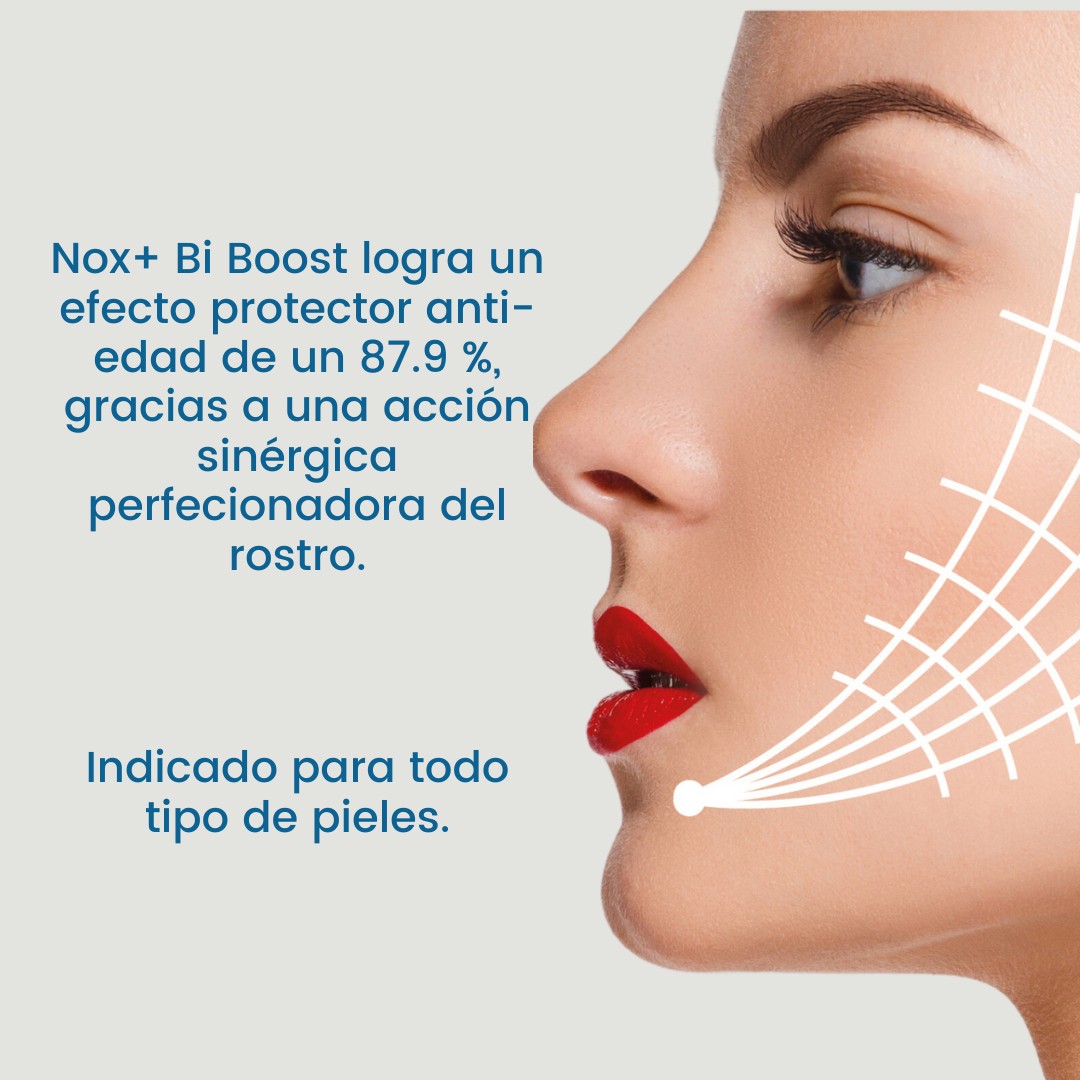 - En estudio elaborado por el instituto de investigación Bionos, Nox+ Bi Boost logra un efecto protector anti-edad de un 87.9 %, gracias a una acción sinérgica perfecionadora del rostro.