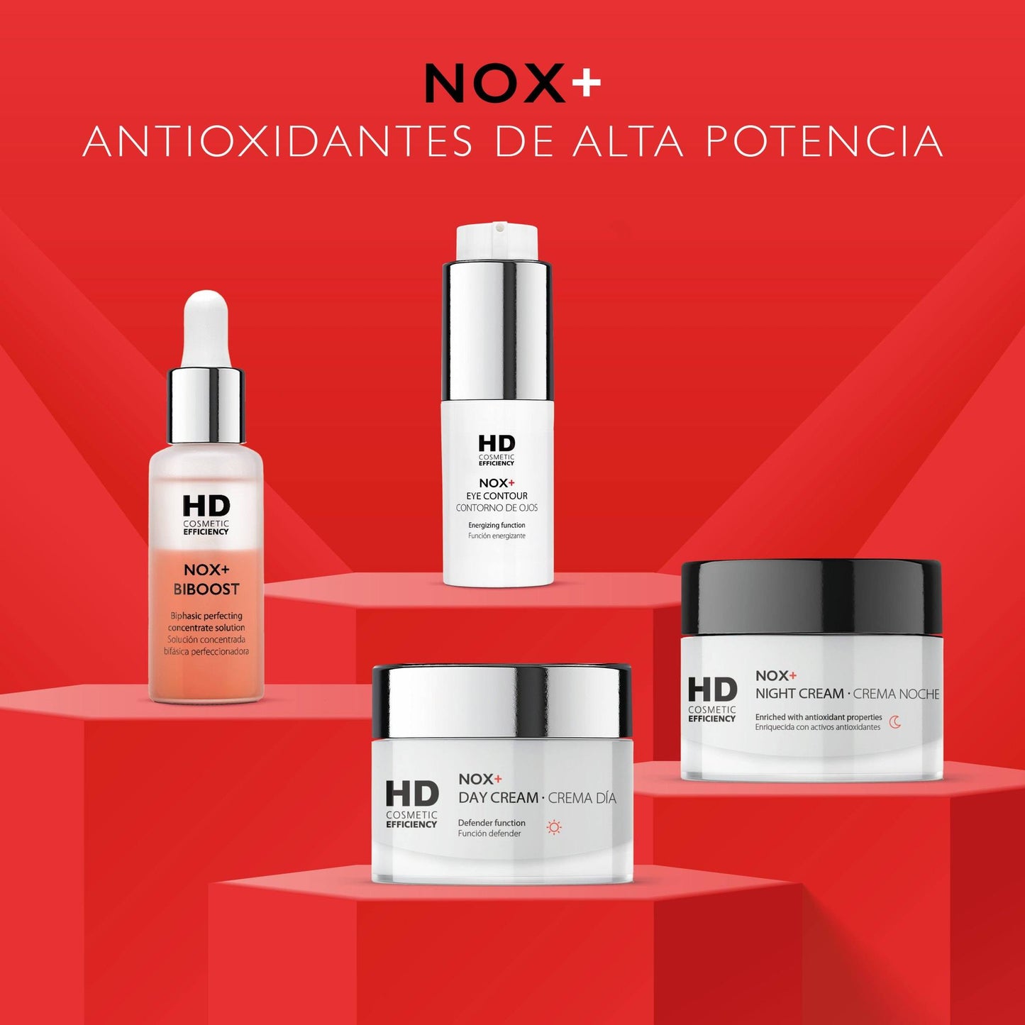 - La fórmula de HD NOX+ BI-BOOST con antioxidantes de alta potencia mejora los resultados detoxificadores y antioxidantes para el tratamiento y prevención del envejecimiento potenciando la juventud de la piel.