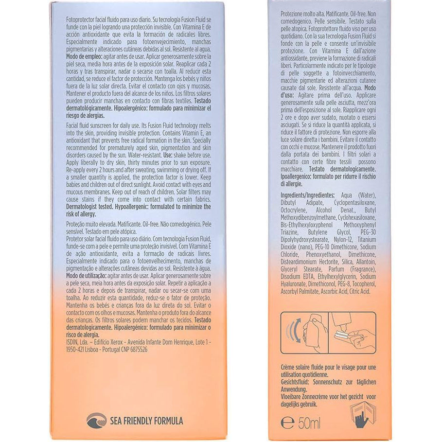 Fusion Water SPF 50 ofrece alta protección UVA/UVB SPF 50 y tiene textura fluida de fase acuosa (formada por el agua y los ingredientes hidrosolubles) que aporta hidratación intensa y absorción inmediata. Posee la exclusiva tecnología de ISDIN que permite aplicarlo por todo el rostro sin miedo a que se irriten los ojos. Fusion Fluid® SPF 50+ está especialmente indicado para las zonas más delicadas y expuestas al sol de la piel sensible. Ofrece muy alta protección UVB/UVA SPF 50+ y tiene textura fluida de rápida absorción que proporciona un tacto ligero, matificante y sin brillos.