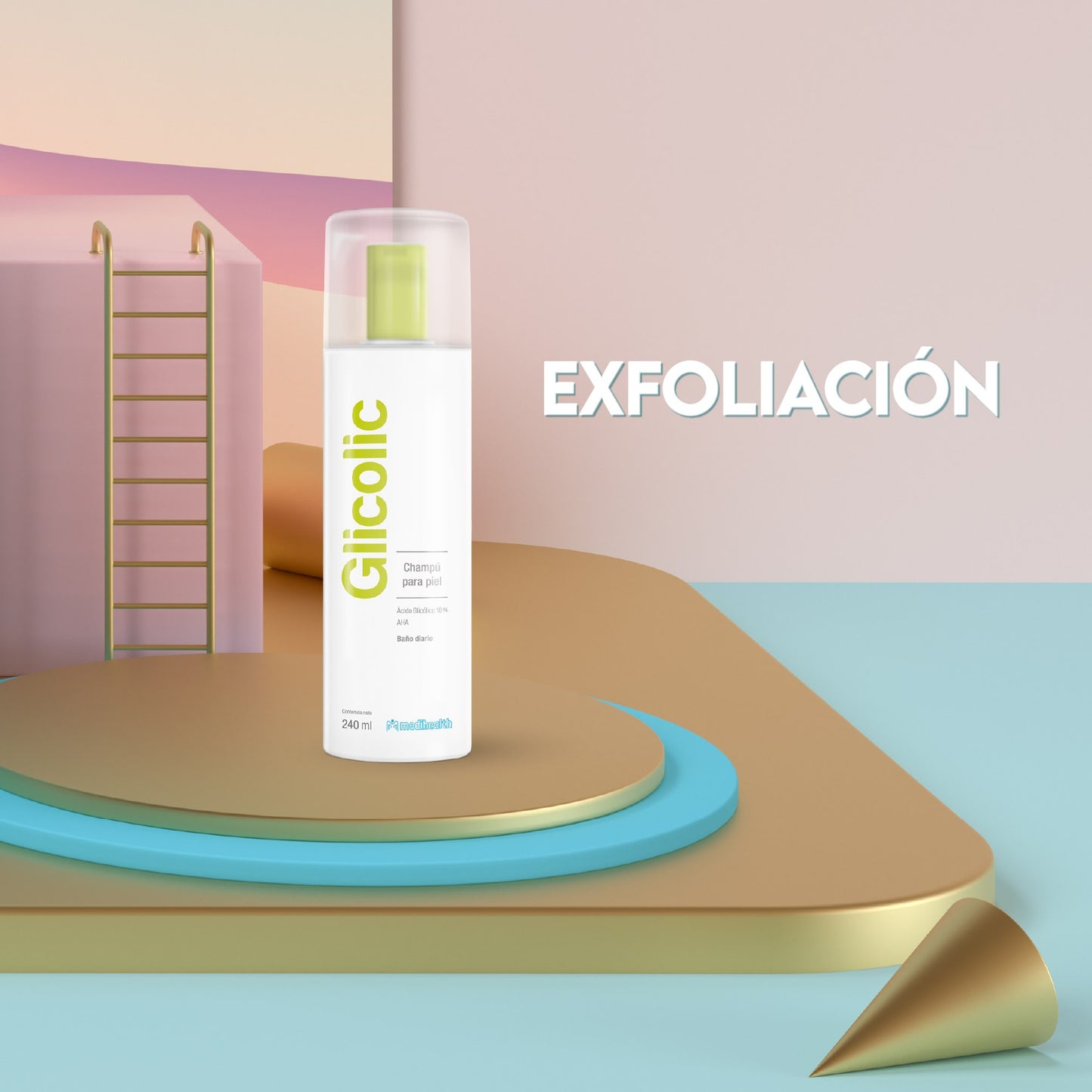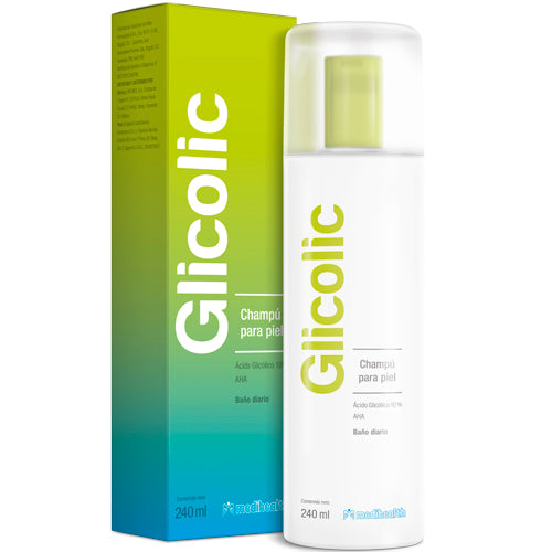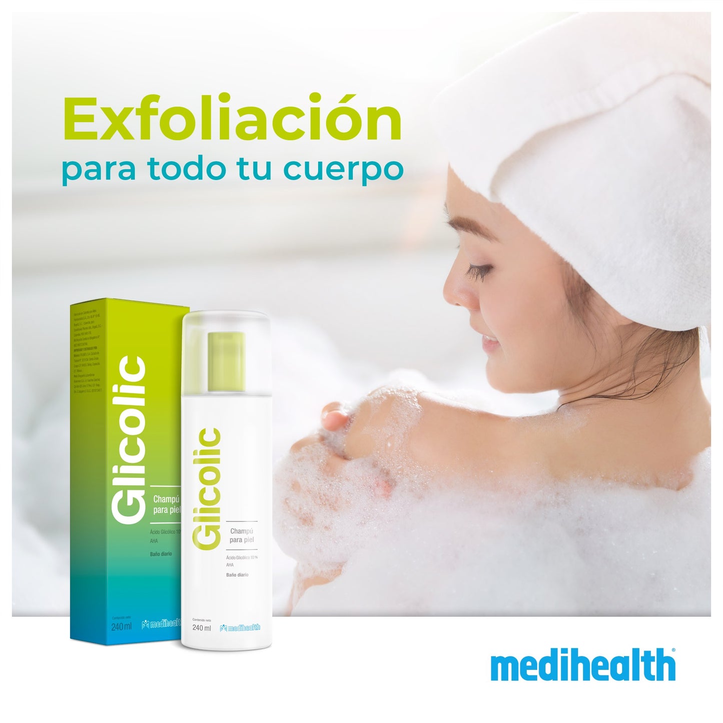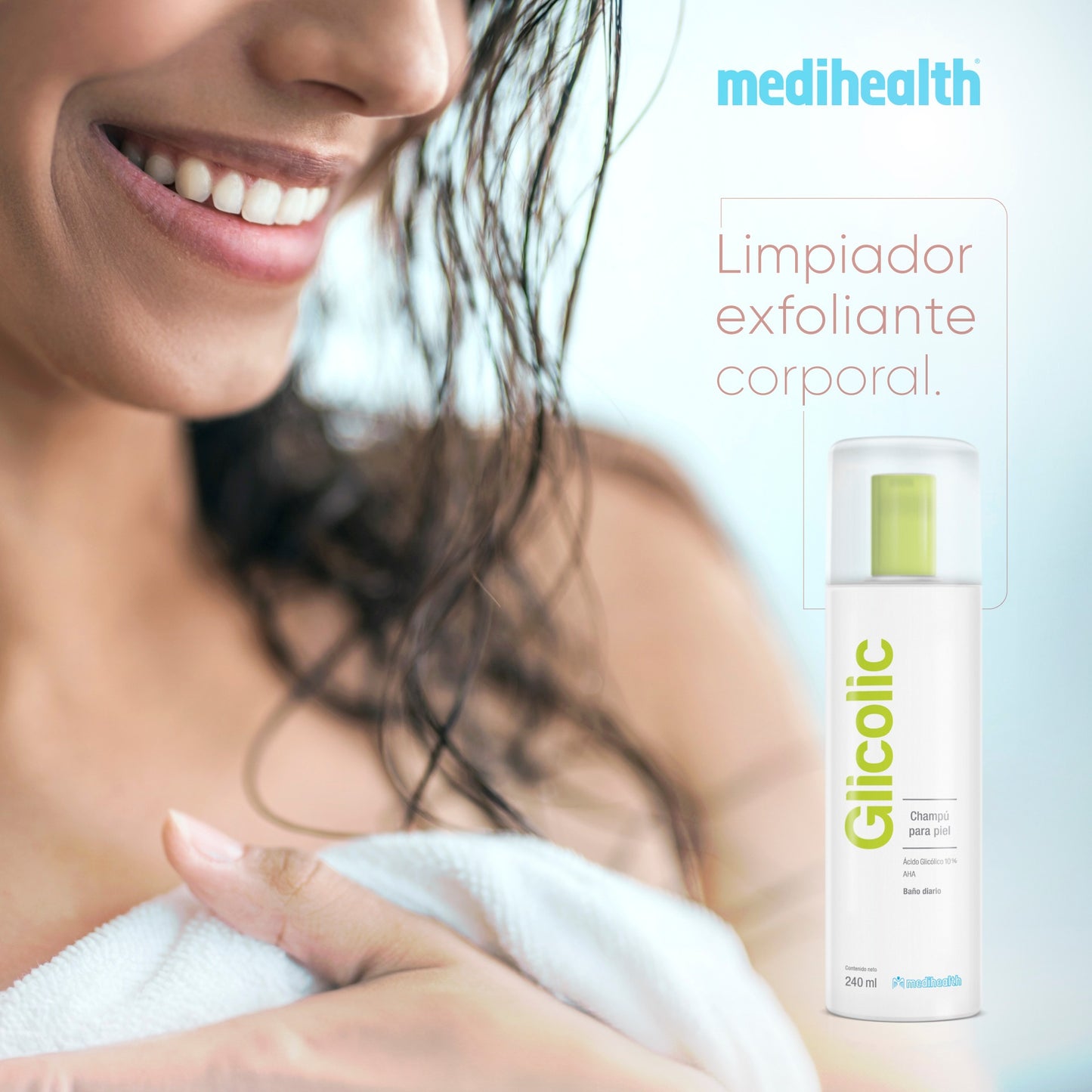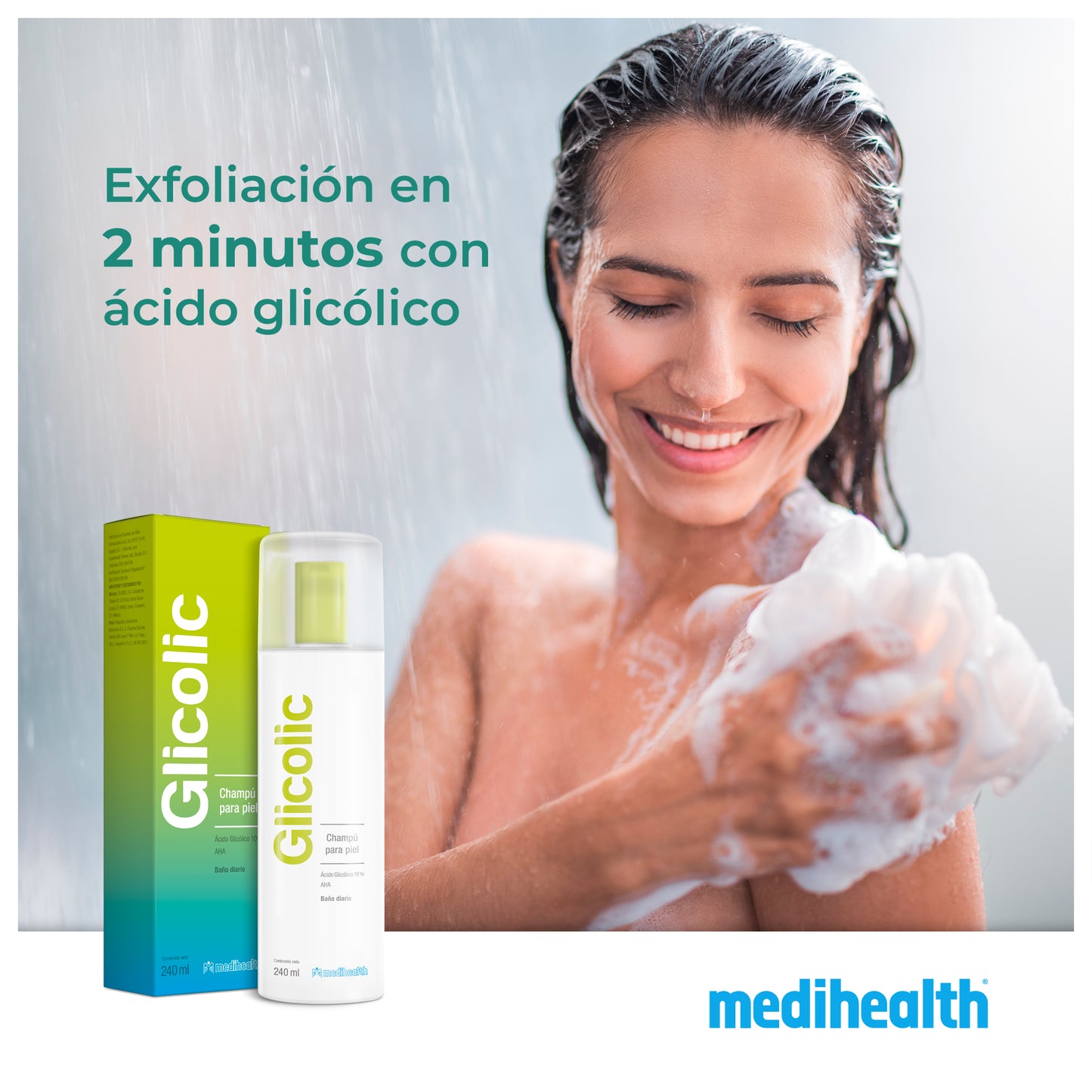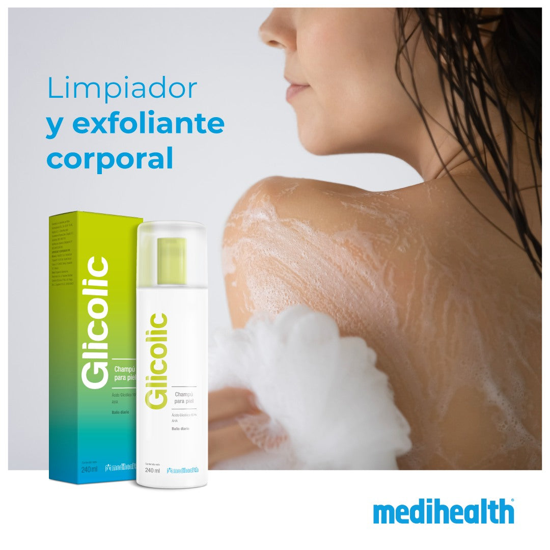 MEDIHEALTH Glicolic Champú para la Piel, Baño Diario, Ácido Glicólico 10%, Limpiador y Exfoliante Corporal. Suavidad y Tersura Natural, 240ml.