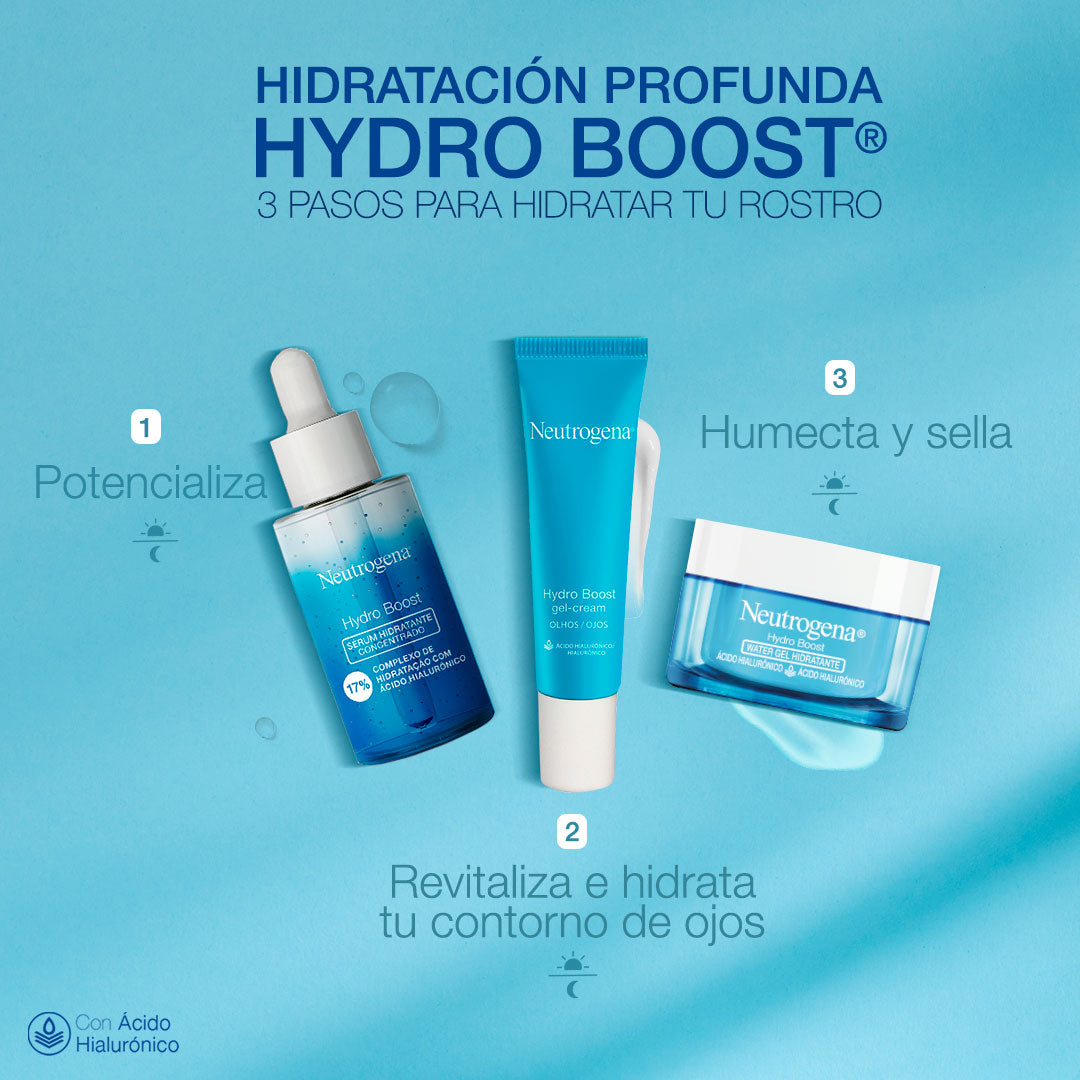 - Aplica una pequeña cantidad de NEUTROGENA Hydro Boost Water Gel sobre la piel limpia del rostro y cuello.