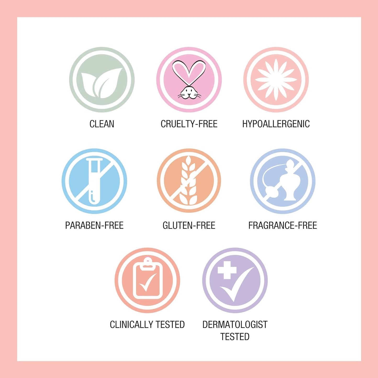 Hipoalergénico. Libre de parabeno. Sin gluten. Aprobado por dermatólogos. Clínicamente probado. Libre de crueldad.