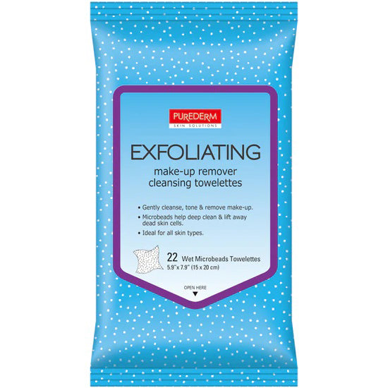 PUREDERM Exfoliating Makeup Remover Cleansing Towelettes, Toallitas removedoras de maquillaje y exfoliación suave que renueva la piel al instante. 22 Toallitas.
