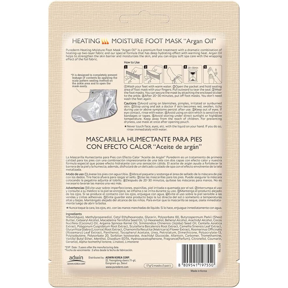 PUREDERM Heating Moisture Foot Mask Argan Oil, Mascarilla Hidratante para Pies con Aceite de Argán, 1 Par.