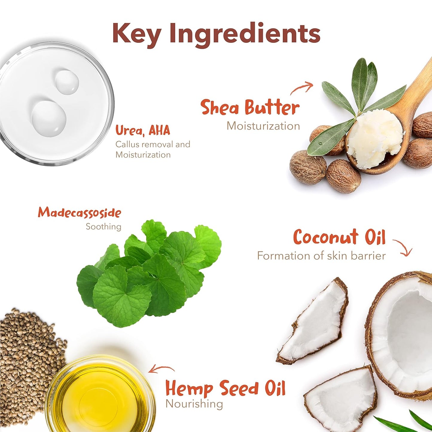 Fórmula vegana y no probada en animales: Es perfecta para tu piel sensible y está hecha para todo tipo de piel. El madecassoside y la manteca de karité despegan naturalmente los callos del talón. El aceite de coco y el aceite de semilla de cáñamo hidratan y suavizan la piel seca para ser como el pie de un bebé.