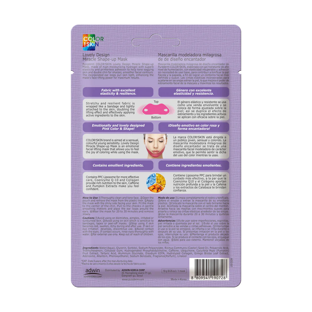 Descubre la magia de la escultura facial con PUREDERM Lovely Design Miracle Shape-up Mask, porque tu rostro merece el toque de cuidado que solo el cuidado coreano puede ofrecer. Eleva tu ritual de cuidado y experimenta la satisfacción de un contorno facial mejorado y una piel rejuvenecida. ¡Cada aplicación es un gesto hacia la belleza y la diversión total!