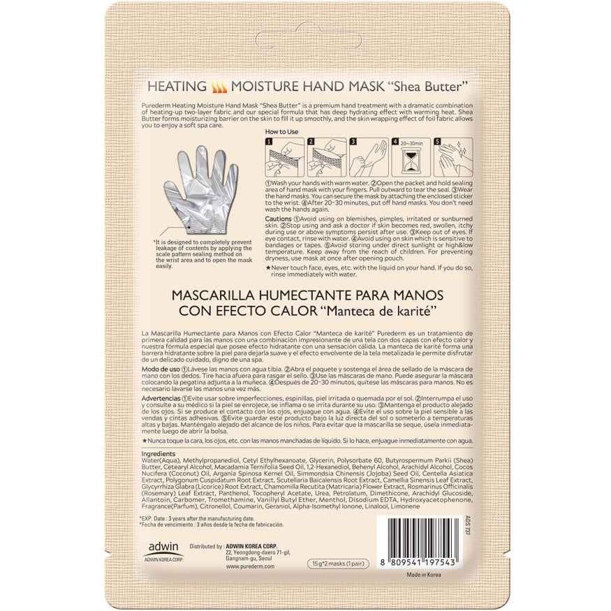 PUREDERM Shea Butter Heating Moisture Hand Mask, Mascarilla Hidratante para Manos con Manteca de Karité, 1 Par.