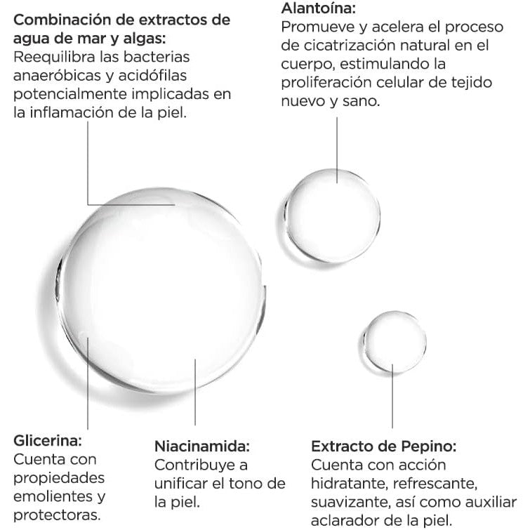 - Combinación de extractos de agua de mar y algas: Reequilibra las bacterias anaeróbicas y acidófilas potencialmente implicadas en la inflamación de la piel.