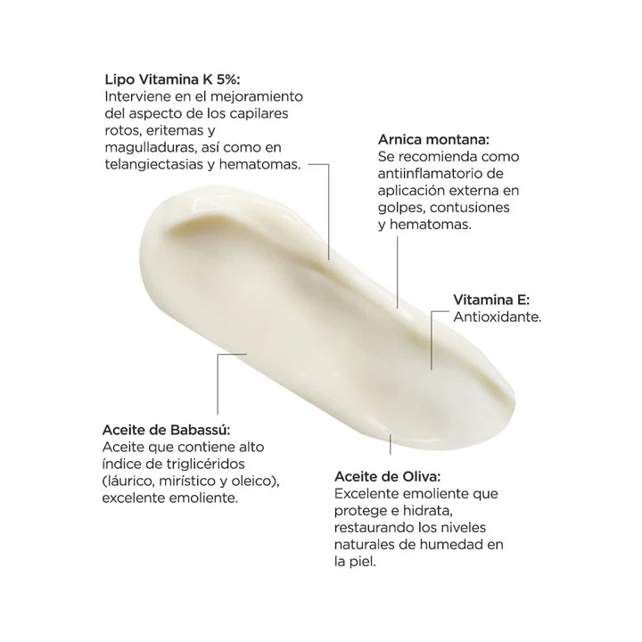Esta fórmula conjuga la capacidad de la Vitamina K para restablecer el buen estado de la piel en conjunto con la acción descongestionante del Extracto de Árnica montana. Para incluir la función antioxidante, cuenta con Vitamina E. Para una mayor emoliencia, la fórmula contiene Aceite de Oliva y Babassú, brindando a la piel una sensación placentera.