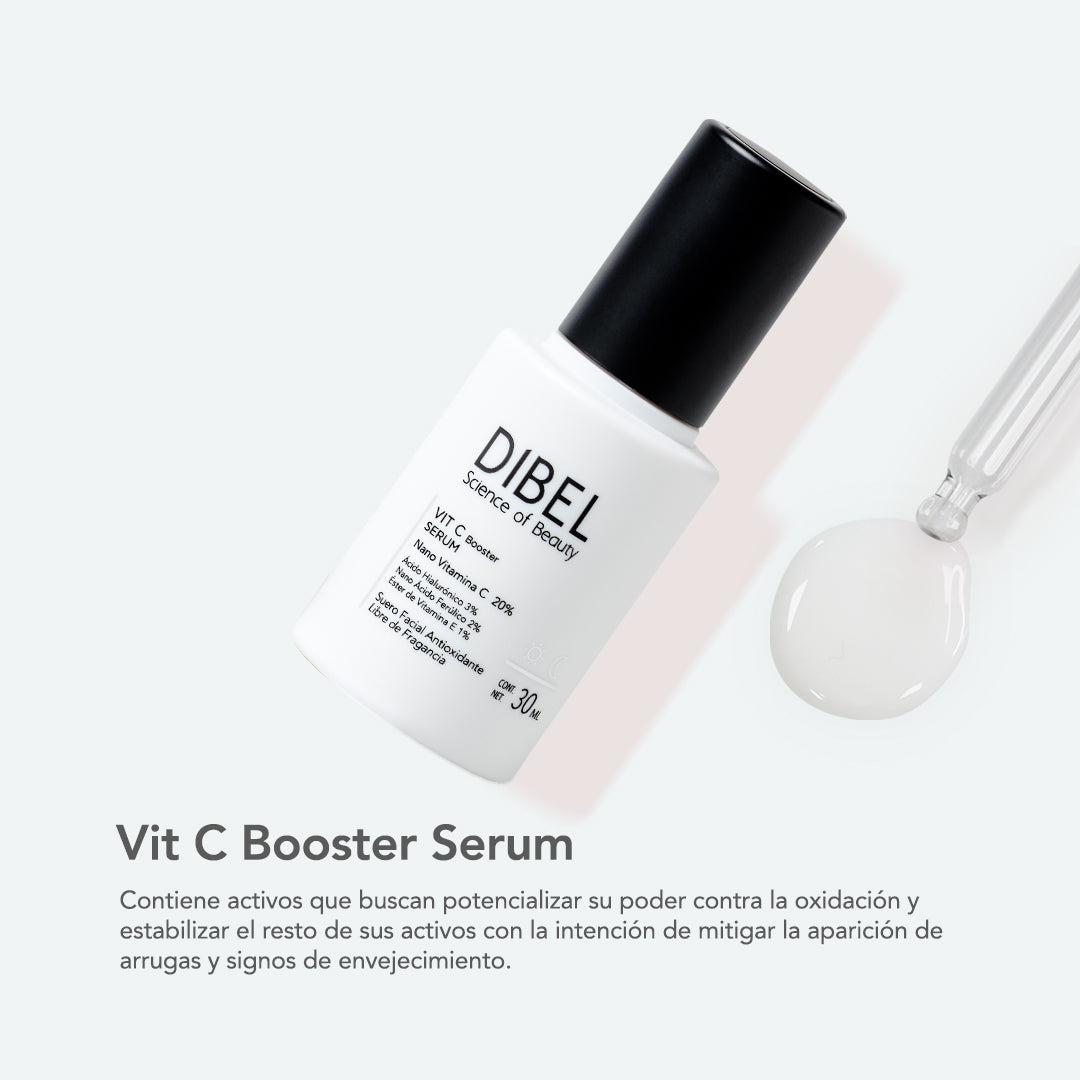 - Partiendo de crear una perfecta sinergia, VIT C Booster Serum apuesta por la combinación de Vitamina C liposomada al 20% con Ácido Ferúlico nanoencapsulado al 2%, permitiéndole potencializar su poder contra la oxidación y estabilizar los activos con la intención de mitigar la aparición de arrugas y signos de envejecimiento. Estos extraordinarios activos, gracias a su forma liposomada y nanoencapsulada, facilitan su penetración y permiten aprovechar al máximo sus beneficios.