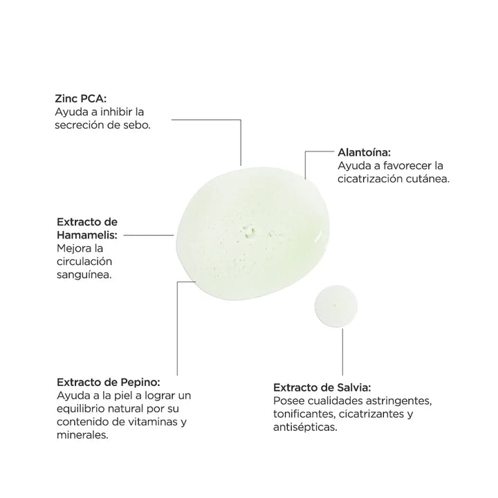 - Cuenta con ingredientes como el Zinc PCA, mismo que apoya a que la epidermis disminuya la secreción excesiva del sebo, dejando una sensación de frescura facial única e ideal.