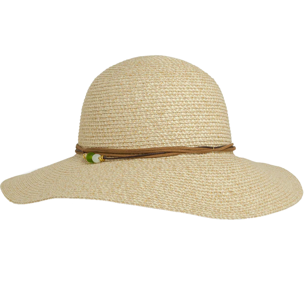 Un modelo con mucho estilo, un ala muy atractiva y un tejido multicolor con un detalle de cintas de piel se conjuntan para hacer de este un gran sombrero.